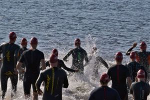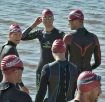 Der Start erfolgte von Land, und wie es der Zufall wollte, hatte ich direkt einen renitenten Brustschwimmer vor mir, der mir den Anschluss an die vordere Gruppe verwehrte. Spätestens an der ersten Boje merkte ich nun auch den sauren Geschmack des Wassers im Mund, der immer unangenehmer wurde. Neben mir tauchte auf einmal Denise auf, aber da die Abstände zwischen den Bojen sehr groß waren, verlor ich die Orientierung und damit auch Denise aus den Augen. Insgesamt gab es für den Kurs nur zwei Bojen, was die Orientierung sehr schwer machte. Auf dem Rückweg zum Schwimmausstieg kamen auch noch Wellen von der Seite hinzu, die einem die saure Suppe direkt ins Gesicht trieben. So schwamm ich mehr oder weniger im Zick-Zack zum Schwimmausstieg und war überrascht, als Denise und Hannes nach 25 Minuten direkt neben mir aus dem Wasser stiegen. Angesichts der Umstände bin ich mit dem Schwimmen zufrieden, allerdings würde ich mir für das nächste Rennen eine bessere Markierung der Strecke und vor allem eine bessere Wasserqualität wünschen.