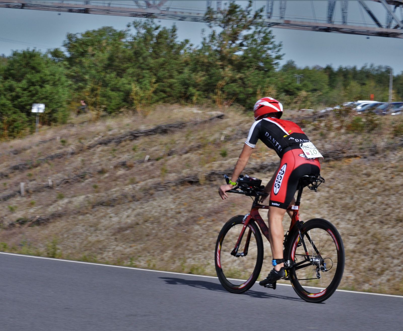 Beim ersten Wechsel ließ ich leider mal wieder zu viel Zeit liegen, was mich ein wenig ärgert und für die nächste Saison definitiv abgestellt werden muss. Denise war die Schnellste in T1 und ging mit einigen Sekunden Vorsprung vor Hannes und mir auf die Radstrecke. Diese führte über einen etwas ruppigen Plattenweg auf eine Landstraße, wo eine Wendepunktstrecke mit 3 Runden zu befahren war. Am Tag vor dem Rennen hatten mein Bruder und ich die Radstrecke bereits besichtigt und so hatte ich hier einen kleinen Vorteil. Der Asphalt war relativ rau, und die flache, offene Strecke machte ihrem Ruf windanfällig zu sein alle Ehre. Trotzdem konnte man auf den langen graden Abschnitten gut drücken, so dass unter dem Strich bei allen Teilnehmern sehr schnelle Radzeiten standen. Leider hatte ich beim Schwimmen etwas zu viel saures Seewasser geschluckt und musste mehrmals gegen den Würgereiz ankämpfen. Außerdem ergaben Power-Gel und saures Wasser eine Mischung, die meinem Zahnschmelz so gar nicht gefiel. Zum Jammern war aber keine Zeit, da ich von einer kleinen Gruppe gejagt wurde und zusah, dass ich den Abstand hielt. Unter dem Strich wurde aber sehr fair gefahren, was ich aufgrund der Streckenverhältnisse anders befürchtet hatte. Nach einer Stunde und 2 Minuten rollte ich mein Rad zurück in die Wechselzone.