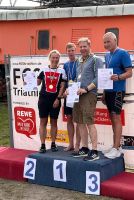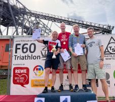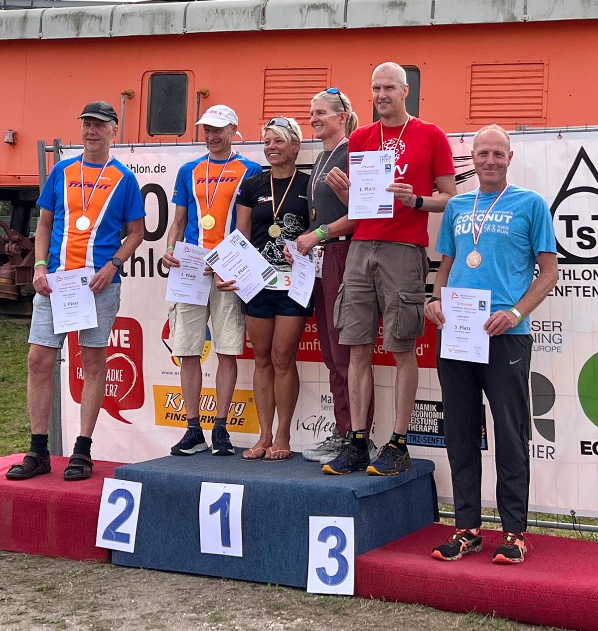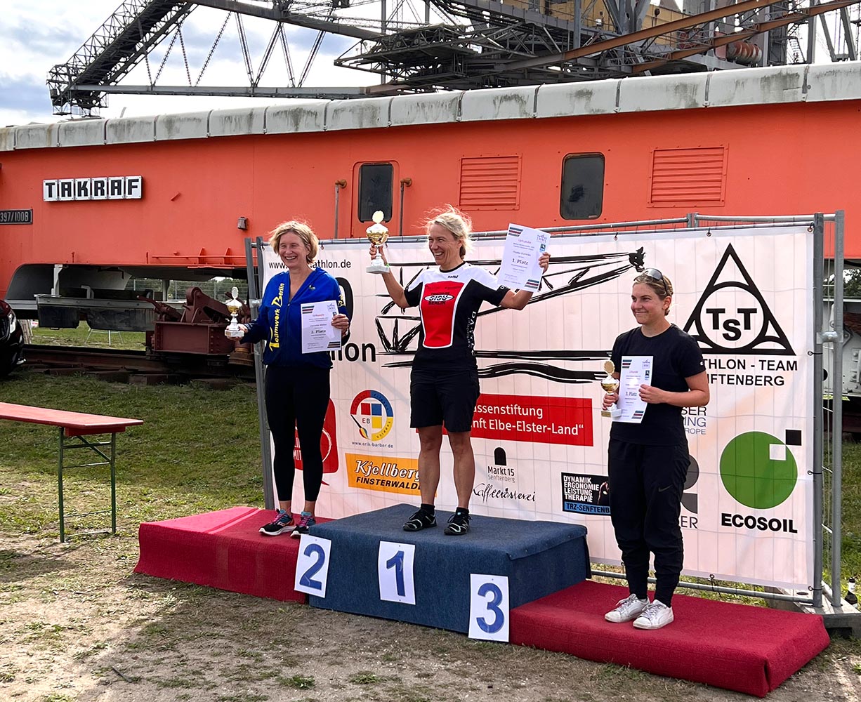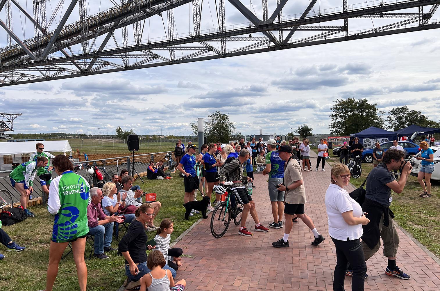 Die neue Laufstrecke hat es in sich: gleich geht es eine Rampe bergan, dann auf sehr sandigem Boden durch den Wald und dann runter zum See. Hier musste man früher bergan: jetzt ist es nicht nur leichter, der Blick über den See auch schöner. Den Schwimmausstieg geht es wieder hinauf zur Wechselzone, davon sind vier Runden zu bewältigen. Mich überholen noch drei Frauen, ich schaffe noch eine zu überholen. Von den Sisus sehe ich beim Laufen niemanden mehr. Der Zieleinlauf unter der Förderbrücke wird ordentlich bejubelt. Die Zielverpflegung ist reichlich, es gibt ein Plätzchen zum Sitzen und wir werten das Rennen aus. Bis zur Siegerehrung bleibt noch Zeit zum Auschecken.