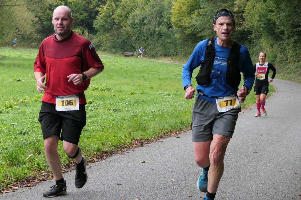 Mein Plan für heute ist so defensiv wie möglich rangehen, das heißt etwa 5:05er Schnitt – gucken was der Puls macht und die Strecke. Perspektivisch geht es abwärts, aber ein paar kleine Anstiege soll es dennoch geben. Untergrund hauptsächlich Asphalt, aber es wird auf Dreck von Holzarbeiten und Maisernte hingewiesen – wird aber nicht vorkommen. Ich bin anfangs allein, nach etwa einem Kilometer hat sich etwas vor mir eine kleine Gruppe gebildet. Ich schließe auf, merke aber dass es hier unharmonisch zugeht und irgendwie auch zu viel Zug drin ist. Also nehme ich wieder ein paar Schritte raus, Wolfgang auch. Sehr praktisch, denn er kennt sich hier aus. Wir laufen die nächsten 15 Kilometer Seite an Seite.