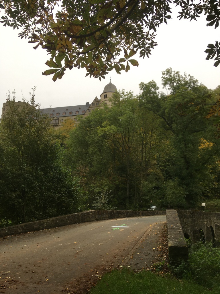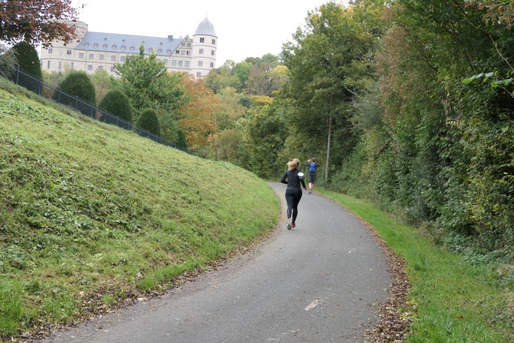 Die Hälfte der Strecke ist geschafft. Neun Minuten langsamer als die Halbmarathonzeit vor sieben Wochen. Zu dem Zeitpunkt denke ich noch, ob ich vielleicht etwas zu vorsichtig losgelaufen bin. Die Wewelsburg thront hier über einem. Obwohl diese nicht erklommen werden muss, wartet im Ort ein knackiger Anstieg, der dann aber in einen seicht abfallenden Feldweg übergeht. Hier kann man es rollen lassen, und ich habe für die nächsten Kilometer einen neuen Kompagnon. Übrigends reißt die Stimmung an der Strecke nicht ab. In jedem Ort wird man durch ein liebevolles Plakat begrüßt und die Großfamilie mit der Lautsprecherbox reist mit und steht immer wieder brüllend am Wegesrand.