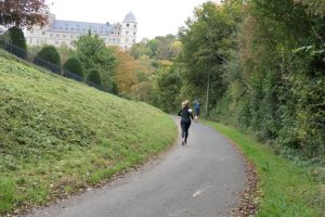 Der Lauf führt auf dem Radweg entlang der Alme, von einem Örtchen namens Ringelstein in den Sportpark nach Paderborn. Ist also eine Punkt-zu-Punkt Strecke. Parallel werden noch 2 Halbmarathons angeboten, man kann den ersten Teil (Oberes Almetal) oder den zweiten Teil (Unteres Almetal) laufen. Von den Zielorten wird jeweils ein Bustransfer zum Start angeboten. Startunterlagen und Wechselbeutel wurden vor ab per Post verschickt, so dass am Bus lediglich die Impfkontrolle stattfindet. Die Fahrt fühlt sich ziemlich lang an, zwischendurch kreuzen wir auch die Laufstrecke.