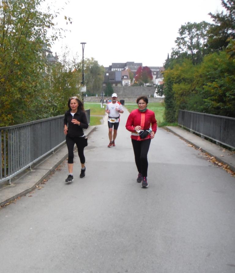 Die ersten Ortschaften werden passiert, und ich bin über die Stimmung überrascht. Ein Posaunenspieler, Kinder haben die ganze Straße mit Kreide bemalt, etwas später eine Großfamilie mit Lautsprecherbox und motivierender Musik. Versorgung gibt es alle 2 bis 3 Kilometer, wenn auch nur Wasser und Apfel. Cola soll es laut Ausschreibung erst ab Kilometer dreißig geben. Die Strecke hat nicht zu viel versprochen: etwas Waldweg, dann ein Brückchen, dann ein Maisfeld und ein herrlich breites Tal. Wenn die Sonne scheinen würde, gar nicht auszumalen diese Idylle! Wir sind etwas langsamer unterwegs ich dachte, und mein Puls ist vorbildlich niedrig, und ich habe das Gefühl bei Wolfgang etwas bremsen zu müssen. Also setze ich mich etwas ab – vielleicht doch zu mutig oder übermütig? Trotz des kleinen Teilnehmerfeldes überhole ich einige, werde aber auch von einer Frau eingeholt. Laut Wolfgang müsste ich somit auf dem 3. Rang sein.