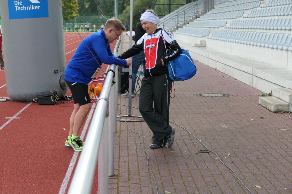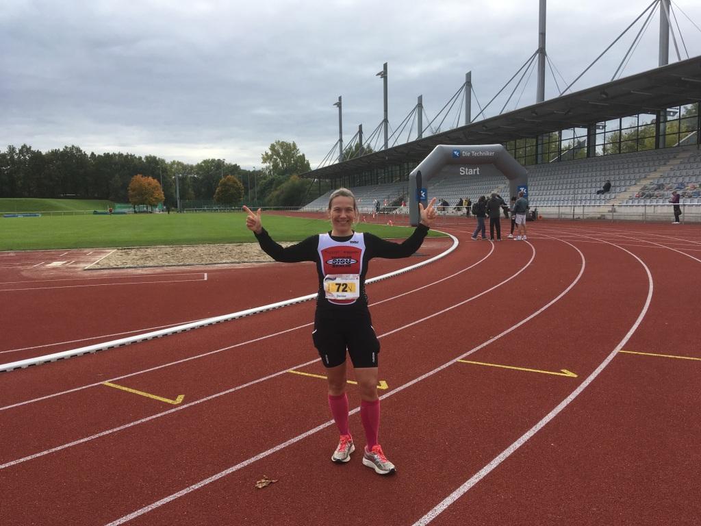 Trotz meines langsamen Schrittes werde ich nur noch zwei Mal überholt und bin sonst ziemlich allein auf den letzten Kilometern. Beim Erreichen der Stadt treffe ich auf die letzten Läufer des zweiten Halbmarathons. Einer läuft in kompletter Feuerwehrausrüstung und ich fühle mich für ein paar Sekunden ganz leicht. Es geht noch um ein paar Gebäude rum, dann erblicke ich den Zielbogen und genieße fast die letzten Meter auf der Stadionbahn. Der Zieleinlauf ist Corona bedingt etwas traurig: kein Stadionsprecher, keine Begrüßung. Auf der Strecke wurde man an jeder Versorgungsstation namentlich erwähnt, hier weiß ich noch nicht mal ob es zum dritten Platz gereicht hat. Siegerehrung gibt es auch nicht. Was für ein trauriger Tag!