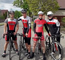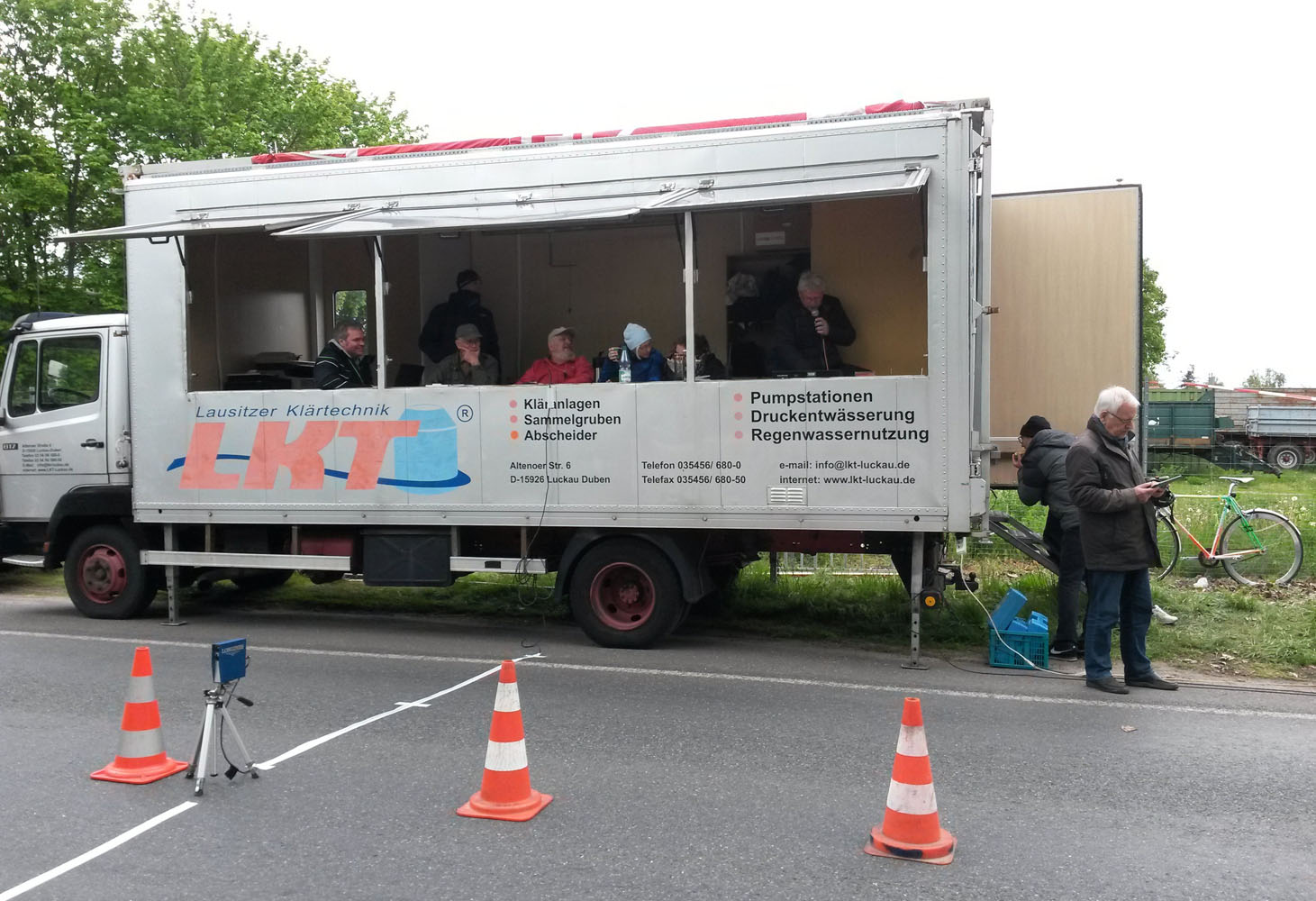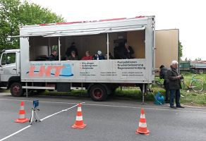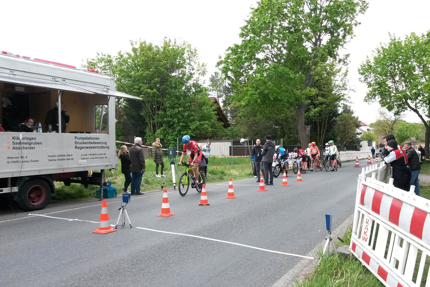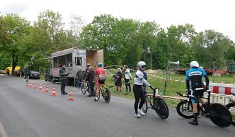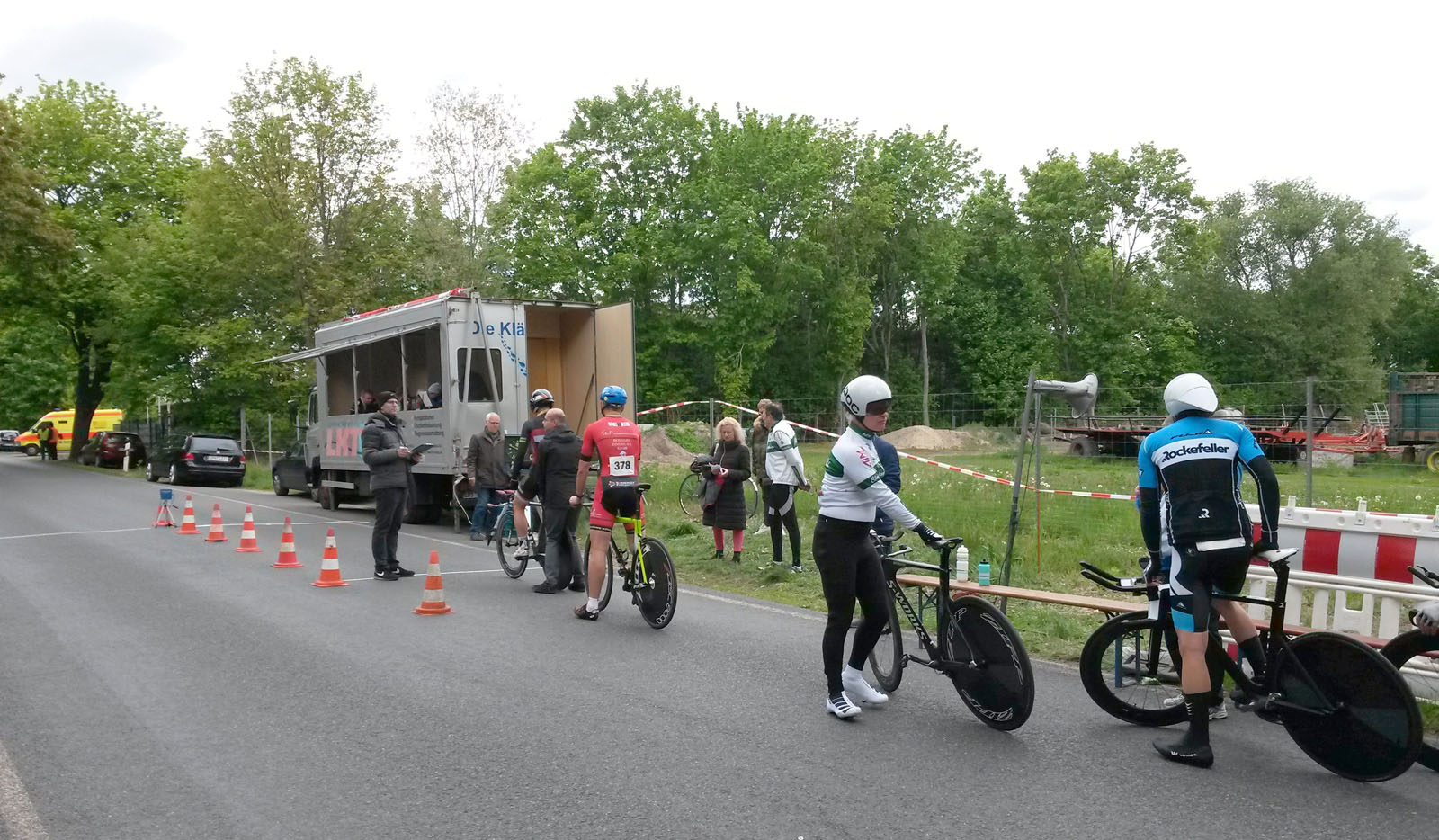 Nach einigen warmen Tagen würde die Temperatur nicht über 10 Grad gehen, und der Wind ist in der Nähe des Flugfelds auf der weitgehend offenen Strecke der Feind Nummer eins der Zeitfahrer. Bei unserer Orientierungsrunde am 1. Mai blies der Wind jedenfalls sehr beeindruckend aus Nordwest. Am Renntag war er immerhin etwas leichter. Man einigte sich größtenteils auf kurze Hosen und lange Ärmel für den Wettkampf. Die befahreren Straßen sind komplett gesperrt, Zeitnahme geht über Startzeit und Zieleinfahrt durch eine Lichtschranke, gestartet wird stilecht mit mechanischer Startuhr und Handanzeige der Sekunden wie bei den Profis, dann geht's Vollgas auf die Strecke.