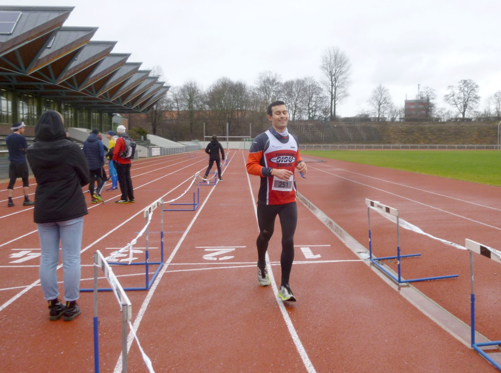 Zum Abschluss der Serie waren außer mir noch Jörg und Sarah am Start. Zu Beginn waren noch trockene und windstille Bedingungen bei Temperaturen knapp über Null. Für mich wiederholte sich bei diesem letzten Lauf leider das Formtief vom Vorjahr, ich fühlte mich ab den ersten hundert Metern kaputt. Also habe ich mich im Basistempo über die Strecke bewegt und mein Ziel darauf geändert, dabei zu sein und die Serie zu finishen. So ging es bis Runde acht von neun – alle, die bei den vorigen Läufen mit mir gelaufen waren, waren längst weg. Zu Beginn von Runde neun entschied sich mein Körper dann plötzlich, doch noch irgendwelche Energiereserven zur Verfügung zu stellen. Nach gut anderthalb Stunden habe ich das auch noch nicht erlebt. Nach der ganzen Schlepperei konnte ich plötzlich die letzte Runde im flotten gewohnten Tempo laufen. Ich dachte mir: Das kann doch jetzt nicht wahr sein. Aber es war auch irgendwie noch ein versöhnlicher Abschluss des Laufes und der Serie. Jörg ist einen starken Halbmarathon gelaufen und hat mich in der Serienwertung noch überholt und auch Sarah hat einen guten Lauf gemacht.
