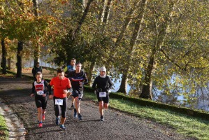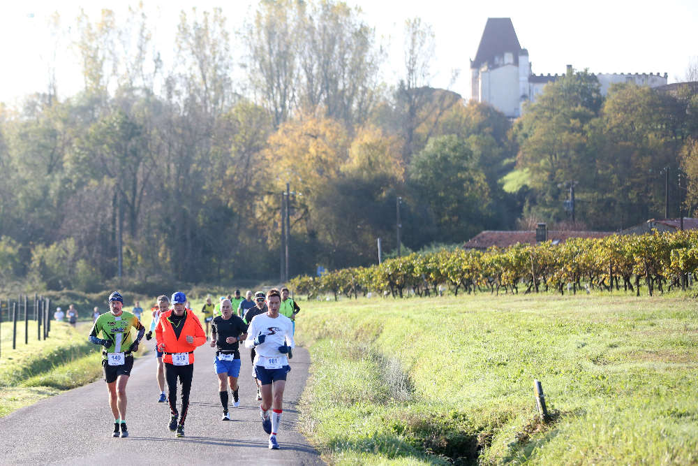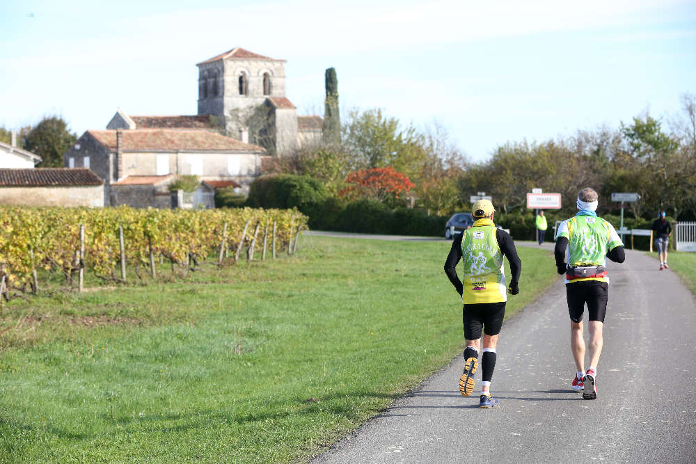 Weiter geht es bald darauf einen Parkweg durch einen Wald, der Weg geht in eine Wiese über - die eigentlich nur noch Matsch und Pampe ist. Mehr balancierend als laufend erreiche ich den Hof eines Schlösschens (Château de Triac), leider bleibt der Straßburger Kompagnon zurück. Gestärkt durch einen Blick auf die Versorgungsstation (neben Cognac gibt es hier eine breite Palette kulinarischer Genüsse wie Schmalzstullen oder Austern) suche ich mir einen neuen Laufpartner. Der ist allerdings mehr mit sich selbst beschäftigt, so trabe ich gerade allein bei Kilometer 37, als mich ein Pärchen überholt und etwas Aufmunterndes sagt. Ich sage, dass ich mich gern die beiden anschließe: eine hervorragende Idee!