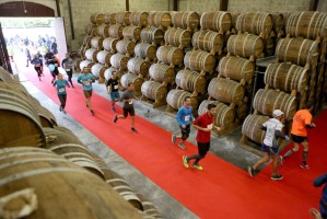 Weiter geht es durch die Weinberge Richtung Jarnac zurück. Dort wartet eines der Highlights des Laufes: die Strecke geht durch die Kellerei von Louis Royer. Am Eingang ist eine große Palette von Cognac Sorten zum Kosten aufgebaut, so viele dass ich Schwierigkeiten habe einen Becher Wasser zu finden.