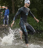 Nachdem mich Andreas Hellstab beim Einschwimmen verhaftet und in die erste Reihe gestellt hatte, musste ich beim Start direkt Gas geben und fand mich in der zweiten Gruppe wieder, die nach und nach immer kleiner wurde. Überraschenderweise lief das Schwimmen wie von selbst, und ich verließ als 6. nach knapp 25 Minuten das Wasser. Auch wenn die Schwimmstrecke 2 bis 300 Meter zu kurz gewesen sein dürfte, ist das für mich eine riesige Verbesserung. Ich hätte mir nie gedacht, dass ich bei einer Mitteldistanz mal so weit vorne aus dem Wasser komme.