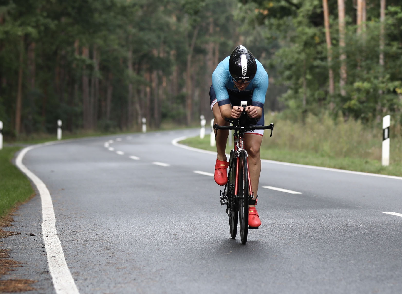 Durch einen schnellen Wechsel, die ich aufgrund der Regionalliga dieses Jahr regelmäßig trainiert habe, konnte ich auf dem Rad schnell zwei Positionen gut machen. Auf der nassen Radstrecke kam ich gut zurecht und behielt auch meine Verpflegung auf den holprigen Radwegen am Rad. Die Spitzengruppe war allerdings zu schnell für mich, so dass ich hier keine Zeit gut machen konnte. Auf der letzten Runde musste ich mich dann durch das Feld der olympischen Distanz kämpfen, zum Glück nahmen die langsameren Athleten aber alle Rücksicht und machten auch an engen Stellen Platz für die schnellen Mitteldistanzler.