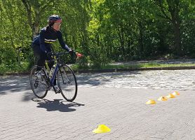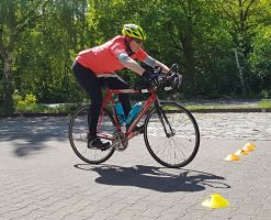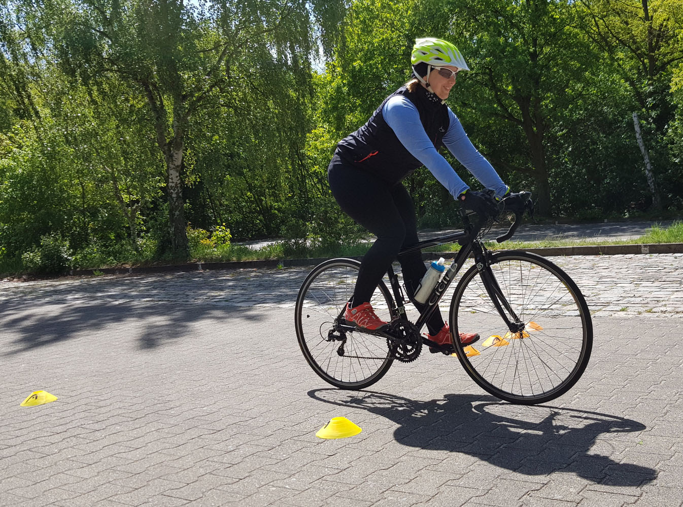 Pünktlich vor 9:30 Uhr nahm uns Regina in der Auerbachstraße in Empfang. Dann ging es für uns 4 Sisu-Frauen auf den Rennrädern gefühlt quer durch die Stadt. Ich saß das zweite Mal auf einem Rennrad und war schon das erste Mal durchgeschwitzt, als wir auf dem Übungsplatz ankamen. Jetzt folgten Übungen, Übungen und Übungen. Hauptziel war die Schulung des Fahrgefühls und der Fahrsicherheit. Ich war erschrocken, denn zunächst hieß es vom Sattel lösen und im Stehen fahren ohne Bremsen. Dann folgten athletische Verrenkungen, um sich neben und hinter den Sattel zu setzen. Anschließend gab es Slalom und Bremsübungen.
