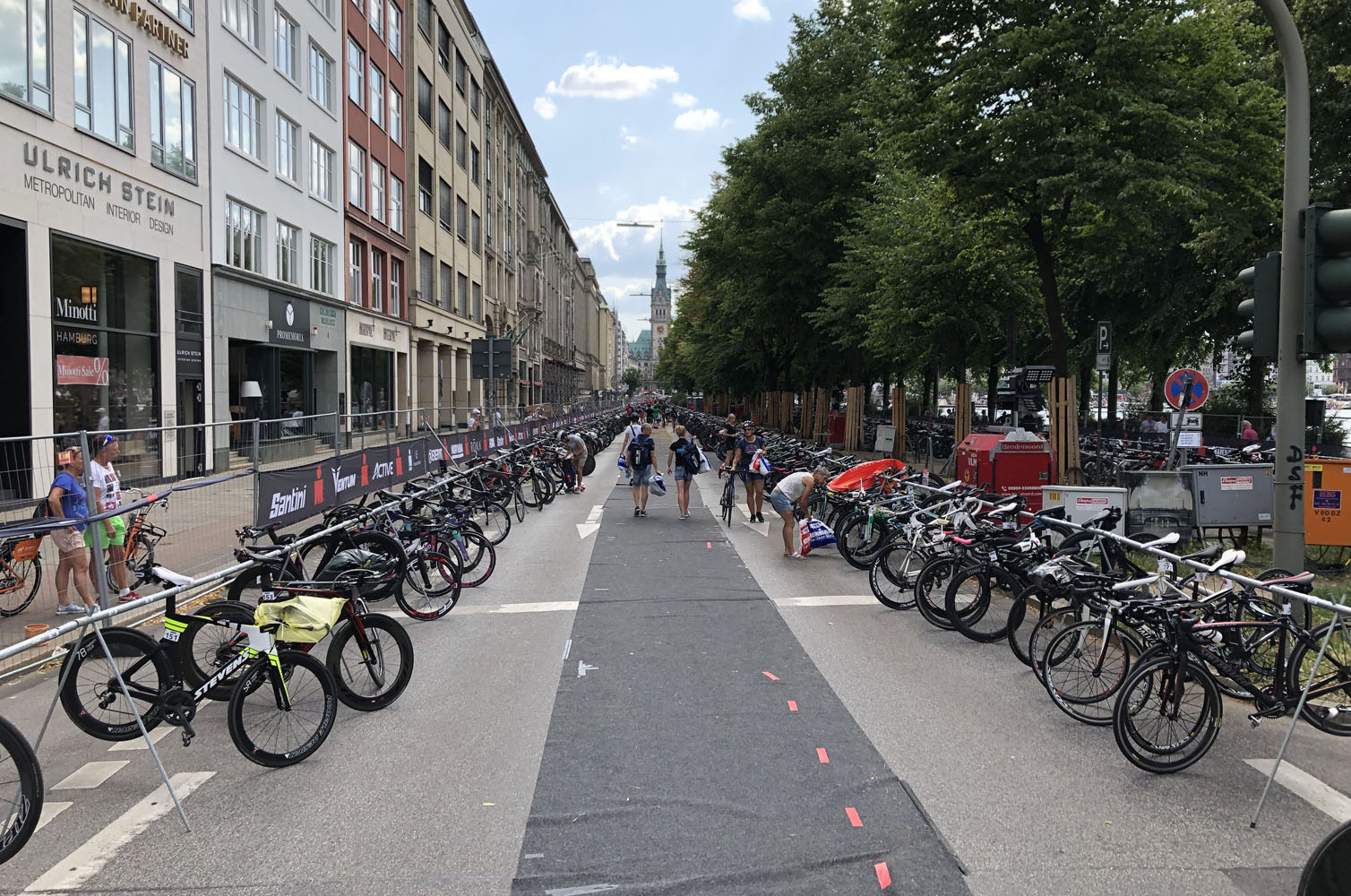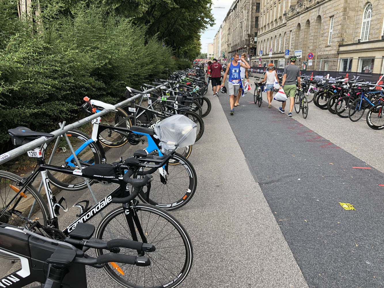 Am Samstag ging es zum Bike check-in und zur Beutelabgabe. Das Beutelsystem war für mich komplett neu (bei allen Triathlons, bei denen ich bisher teilgenommen habe, wurden die Sachen einfach am Fahrrad deponiert). Ich habe jeden Beutel mindestens fünf mal überprüft, um sicher zu gehen, dass auch alles eingepackt ist. Nachdem ich mein Fahrrad an der Nummer 1265 abgestellt hatte und die Beutel an ihren Haken hingen, bin ich die Wechselzone nochmal von vorne bis hinten abgelaufen, um ein Gefühl für die Strecke zu bekommen. Die gesamte Wechselzone ist massiv. Aufgeteilt in vier Reihen – jeweils zwei pro Straße – ist es schwer, das Ende zu sehen. Ironman Hamburg behauptet, es sei die längste Wechselzone der Welt und mit 500m Laufdistanz vom Eingang zum Radaufstieg ist es sicher ein starker Mitbewerber um diesen Titel.