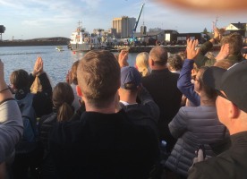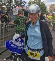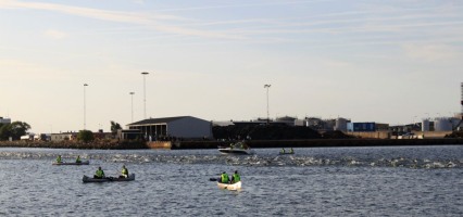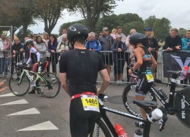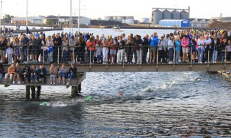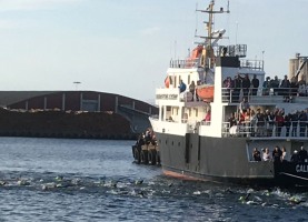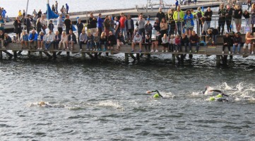 Der Wind kommt von hinten, die Wellen tragen einen förmlich. Igitt, was war das? Fühlte sich nach einer Qualle an. Kurz darauf ein ganzes Feld. Zum Glück bleibt es bei dieser kurzen Begegnung. Nach der nächsten Kurve finde ich einen Wasserschatten, den ich auf der Rückgeraden, entgegen dem Wind, gut nutzen kann. Leider verliere ich ihn irgendwann, und die Wellen machen die Orientierung etwas schwerer. Es geht zurück sehr nah an die Kaimauer ran, die oben mit Zuschauern gefüllt ist. Den tosenden Applaus von höre ich nicht, kann ihn aber bei den vielen Leuten erahnen. Hier am Ufer stinkt das Wasser. Es geht durch eine kleine Brücke, das Wasser wird merklich kühler aber unter mir ist alles voller Seetang. Ich versuche, so weit wie möglich vom Ufer entfernt zu schwimmen, aber auf den letzten Metern muss ich doch mehrmals stoppen, um mich von dem Gestrüpp zu befreien. Als ich beim Ausstieg 1:01 h auf der Uhr sehe, glaube ich es kaum. Nach den Vorkommnissen im Wasser hätte ich mit ein paar Minuten mehr gerechnet.