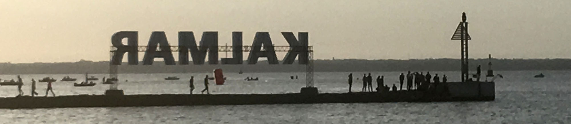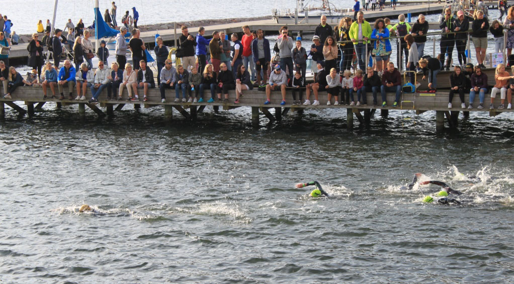Beim Einordnen zum Rolling Start gehen wir in die Mitte von 1h und 1:10h, Max dann noch etwas nach hinten. Es wird andächtig die schwedische Nationalhymne gesungen, dann verkündet ein Kanonenschlag den Start. Schritt für Schritt nähere ich mich der Rampe. Die Athleten werden hier am laufenden Band ins Wasser gelassen, also nichts mit zeitlichen Abständen von ein paar Sekunden. Der Schwimmstart ist entsprechende heftig. Ein wirkliches Gehaue und Geprügel. Dazu kommt ein heftiger Bass der Musik, der von der Kaimauer aufs Herz drückt. Kurz darauf knallt einem die Morgensonne ins Gesicht. Ich sehe nichts, selbst mit kurzem Brustzug und hoch erhobenen Kopf. Ich kann noch nicht mal erkennen, was die Schwimmrichtung der anderen ist – es scheint kreuz und quer zu gehen. Also einfach durchhalten, bis ich dann doch eine Boje erkennen kann. Nach ca. 600 Meter gibt es eine 90 Grad-Wende, dann ist die Orientierung einfach: immer auf die Ölandbrücke zu.