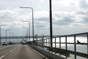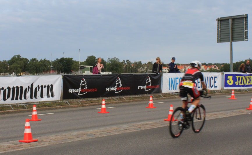 Schon nach wenigen Metern geht es zum Highlight der Tour über die 6 Kilometer lange Ölandbrücke (das Foto anbei ist während einer Autofahrt an einem anderen Tag gemacht, da sonst Fußgänger und Radfahrer strengstens auf der Brücke verboten sind). Der Blick über das Wasser ist herrlich. Mit dem Wind geht es auf der Brücke ganz gut, so dass ich mich erst mal ordentlich versorgen kann. Auf Öland sind es dann 40 Kilometer geradeaus nach Süden. Das heißt 40 Kilometer Gegenwind. 40 Kilometer Geduld bewahren und nicht zu viel Kraft verschwenden. Ich halte mich an meinen Menüplan, den ich auf die Aeroflasche geklebt habe. Ansonsten genieße ich die Landschaft und freue mich der netten Abwechslung am Streckenrand. Immer wieder Leute, Musik, Applaus. Ein ganzes Dorf ist mit Luftballons geschmückt, es gibt Picknickrunden diverser schwedischer Sportvereine und nicht selten sieht man eine Oma auf einem Campingstuhl einen Löffel auf einen Kochtopf hauen.