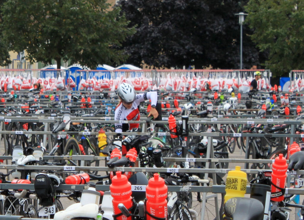 Dem Wechsel widme ich etwas mehr Zeit, da ich mich auf Grund der Temperatur für ein zusätzliches Shirt, Socken und Ärmlinge entscheide. Ich schnappe mein Rad mit einem: "so Schatzi, dann werden wir mal" und laufe los. Vor mir einer im Sisu Outfit. Max?! Der konnte sicher nur so schnell schwimmen, da ich den Weg von Quallen und Gestrüpp gereinigt habe.