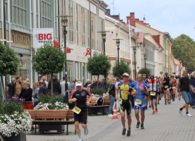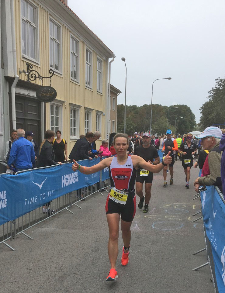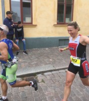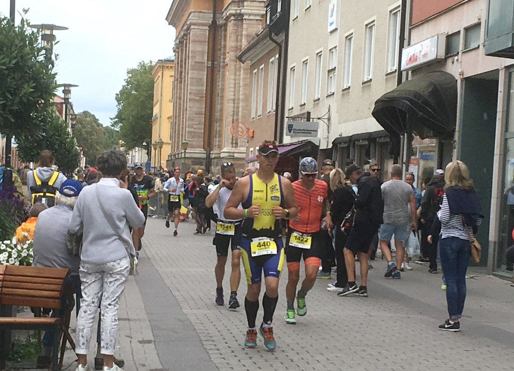 Zurück in Kalmar geht es auf einen Kreisverkehr, deren Streckenführung zwar ausführlich in der Vorbesprechung erwähnt wurde, ich aber nicht verstanden habe. Das ergibt sich von allein. Überrascht bin ich vom Publikum an besagter Wendepunktstrecke. Da stehen Tausende! Ich habe noch nie in Schweden so viele Leute auf einmal gesehen. So gepusht geht es auf die letzten 60 Kilometer auf dem Festland. Statt der kargen Landschaft von Öland schöne Wälder. Zudem wird die Strecke ein kleiner Zickzack-Kurs, also sehr abwechslungsreich und der Wind wechselnd aus allen Richtungen. Überraschend schnell kommt die Verpflegungsstation bei Kilometer 150. Ich stelle zufrieden fest, den Ernährungsplan annähernd eingehalten zu haben. Noch zufriedener bin ich über meinen Gesamtzustand. Es geht mir hervorragend. Klar, etwas steif im Nacken, das Knie puckert etwas und sicherlich nicht mehr ganz frisch. Aber ich habe etwas ganz anderes erwartet. Selbst auf den letzten Kilometern kein Problem die Aeroposition zu halten. Ein hoch auf das Athletiktraining. So geht es auf der Überholspur bei starkem Gegenwind zurück in die Stadt. Total glücklich mit einer Zeit von etwa 5h50 steige ich vom Rad. Wechsel geht ruck zuck und ab auf die Laufstrecke.