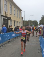 Auf den ersten Laufmetern muss ich mich natürlich ordentlich bremsen. Gar nicht so einfach bei den jubelnden Massen am Streckenrand. Von hinten kommt auch noch Max vorbei, der mich versucht weiter anzutreiben. Es geht nach Norden leicht ansteigend aus der Stadt heraus. Abschnittsweise kommen einem die Läufer auf dem Rückweg entgegen. Als wirklich schön würde ich die Strecke nicht bezeichnen. Entweder läuft man mitten auf der Straße an Einfamilienhäusern vorbei oder auf asphaltierten Radwegen. Ab und zu kann man ein Blick auf die Ostsee erhaschen. Ruhe hat man keinen einzigen Meter. Überall ist Publikum und feuert einen ordentlich an. In Bergan ist der Gipfel der Runde erreicht, hier kann man quasi von einer Stimmungshochburg sprechen. Leute, Party-Musik und überall Schilder und Banner mit motivierenden Sprüchen. In Bergan ist auch ein kleiner Hügel zu bewältigen – sehr steil aber ganz kurz. Dann geht es zurück in die Stadt. Da hier immer noch starker Gegenwind herrscht, läuft es sich doch etwas mühsam. Die Strecke führt schließlich in ein Stadion auf eine Tartanbahn, wo man ein Bändchen für die absolvierte Runde bekommt.