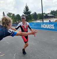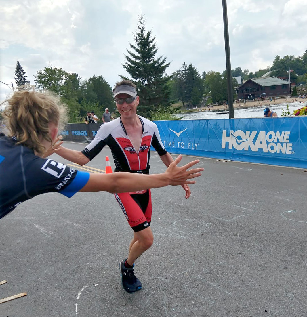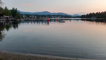 Mit Erleichterung nahm ich auch die Neo-Freigabe zur Kenntnis. Gemütlich ging ich an den Mirror Lake, wo das Schwimmen stattfinden sollte. Dieser liegt direkt am Zentrum des Ortes Lake Placid, im Gegensatz zum gleichnamigen See. Das Wetter war gut und entgegen der ersten Befürchtungen der Vortage hatte sich auch kein Gewitter aufgetan. Nach und nach füllte sich das Seeufer mit Teilnehmern und Zuschauern und am Schluss musste ich mich doch etwas beeilen den Neo anzuziehen und – während um mich herum die Nationalhymne gesungen wurde – mich in die Nähe meines Starterfeldes entsprechend meiner anvisierten Schwimmzeit zu wühlen. Schon hörte ich den Start und im Pulk bewegte ich mich langsam zur Startlinie. Nochmal High-Five mit Mike Reilly, der Stimme von Ironman, Brille aufgesetzt und ab ins Wasser! Es werden zwei Runden mit einem kurzen Landgang dazwischen absolviert. Perfekte Temperatur, klares und glattes Wasser – gute Voraussetzungen also. Und obwohl es auf den ersten paar Hundert Metern etwas eng war, hatte ich recht schnell meinen Rhythmus gefunden. Nach meiner Wunschzeit von knapp unter 2 Minuten pro 100 m kam ich aus dem Wasser und ließ mich von zwei Helfern aus dem Neo schälen – eine Hilfe die ich aus anderen Rennen noch nicht kannte.