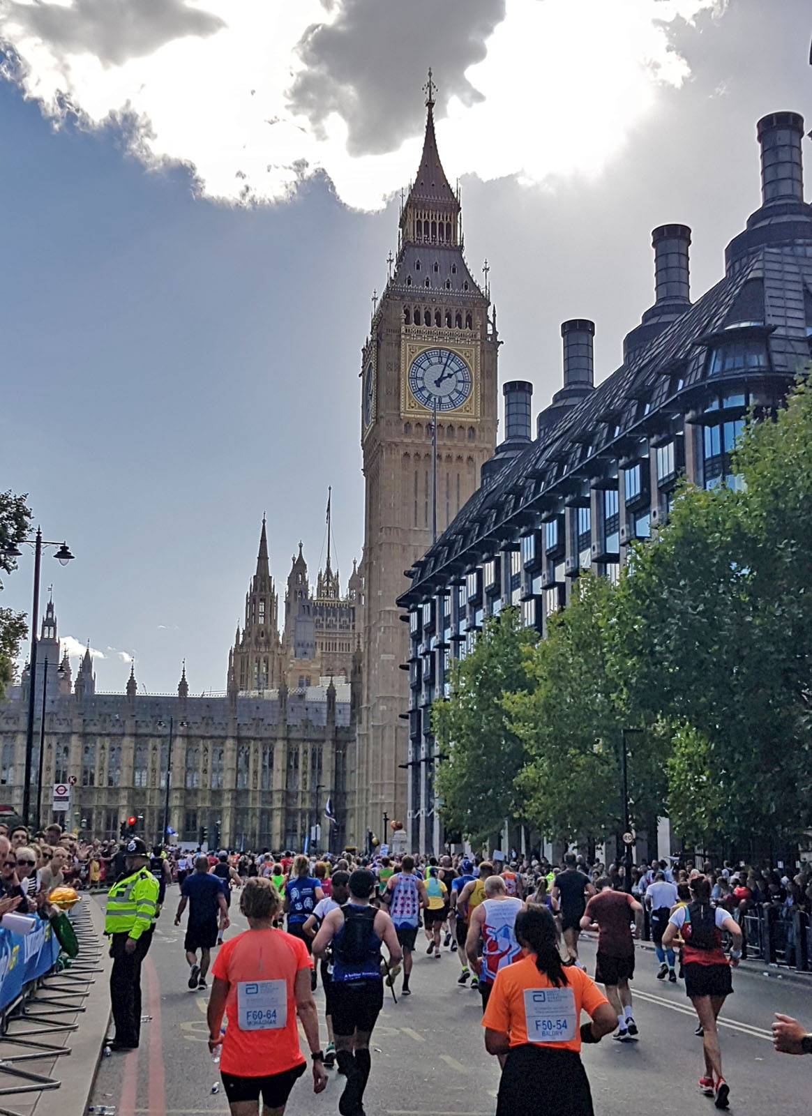 Der Kurs ging dann an der Themse entlang durch die City of London durch. Funfact: dem Bürger der City of London ist es auch heute noch erlaubt, öffentlich ein Schwert tragen. Die Themse und die Laufstrecke bogen dann Richtung Süden ab nach Westminster. Auf der anderen Flussseite war dann das London-Eye zu sehen, das zweitgrößte Riesenrad Europas (seit wenigen Wochen steht das höchste in Moskau, ist aber derzeit nicht in Betrieb). Und dann kam auch schon der Big Ben und der Palace of Westminster, der Sitz der britischen Regierung.