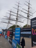 Der Start in vielen Wellen war gut organisiert und entzerrt. Der Start war mir etwas zu unspektakulär, fast ohne Zuschauer und somit kaum Stimmung auf den ersten Kilometern. Es wirkte ein bisschen, als würde man von außerhalb erst in die Stadt reinlaufen. Aber nach der Vereinigung der drei Startstrecken wurde es turbulent. Bei Kilometer 10 sind wir eine Schleife gelaufen um ein großes Segelschiff drumrum, die Cutty Sark, früher der schnellste Teetransporter, heute ein Museumsschiff. Das nächste Highlight war die Überquerung der Themse über die Tower Bridge bei Kilometer 20, einer der größten Stimmungs-Hotspots.