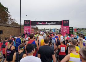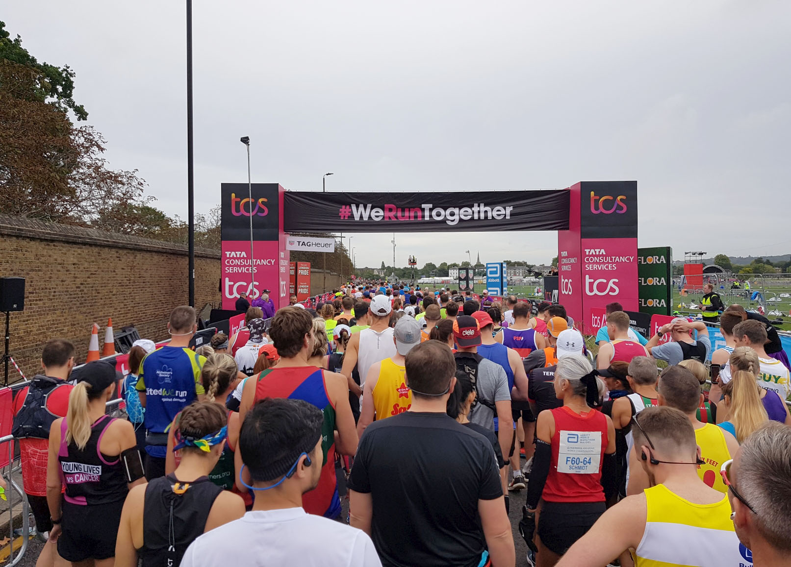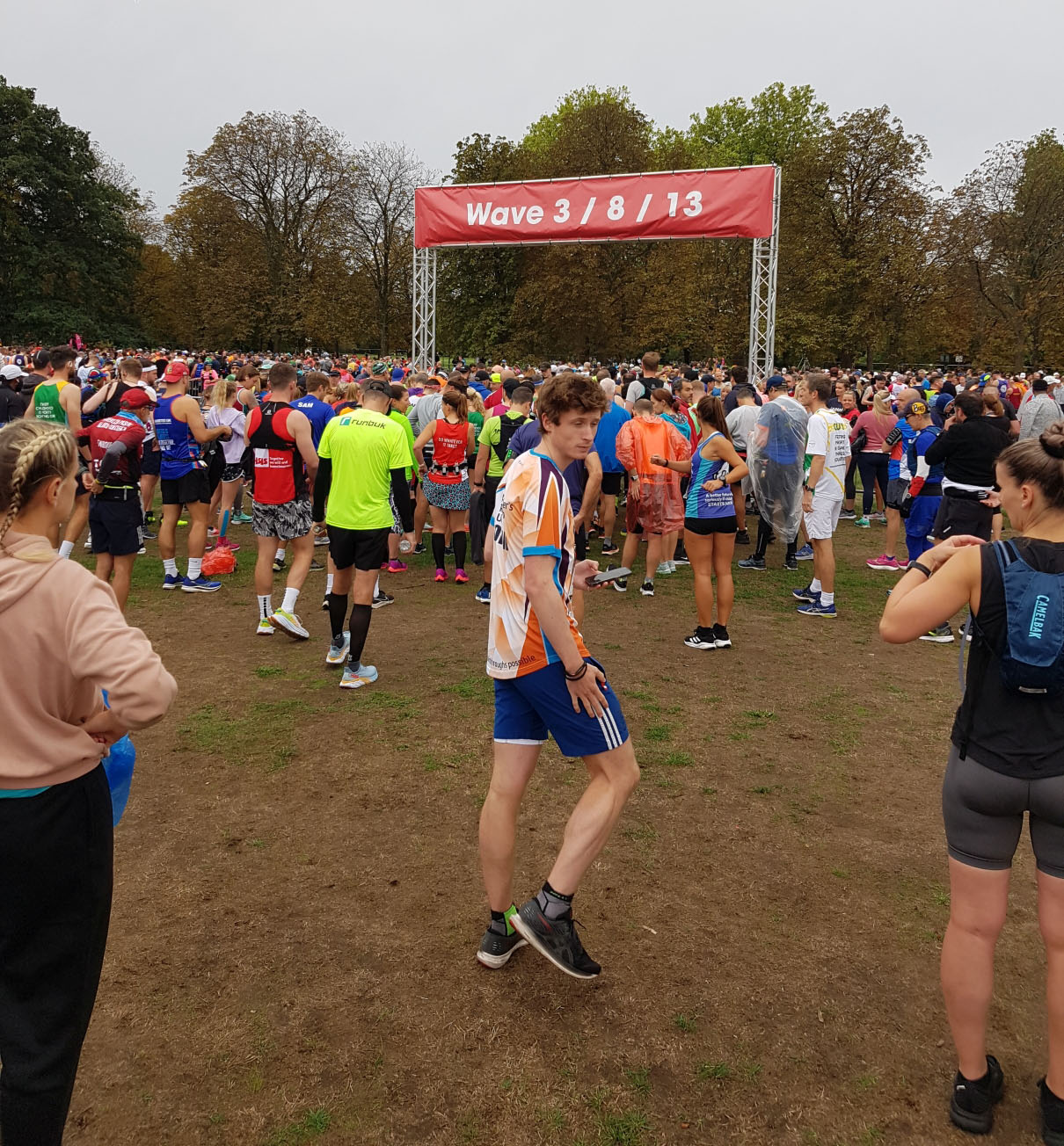 Sonntag Morgen gab es ein ganz entspanntes Frühstück gegen 8 (meine Startzeit war erst 10:05 Uhr). Es war bewölkt mit Aufklarung bei 12 °C (steigende Tendenz), optimales Laufwetter. Auf dem Weg zu meinem Startareal in Greenwich Park mit den Öffentlichen habe ich dann schon jede Menge Deutsche getroffen und von den Wiederholungstätern ein paar Tipps zur Strecke erhalten. Es gab drei verschiedene Startpunkte, die drei Strecken haben sich dann auf der 3. Meile vereinigt. Mein rotes Startareal war einfach zu finden und sehr geräumig. Sehr viele Dixis waren aufgestellt, da gab es zwar auch sehr lange Schlangen (> 20 m), aber es ging zügig voran. Kleiderabgabe an den LKWs ging auch problemlos.