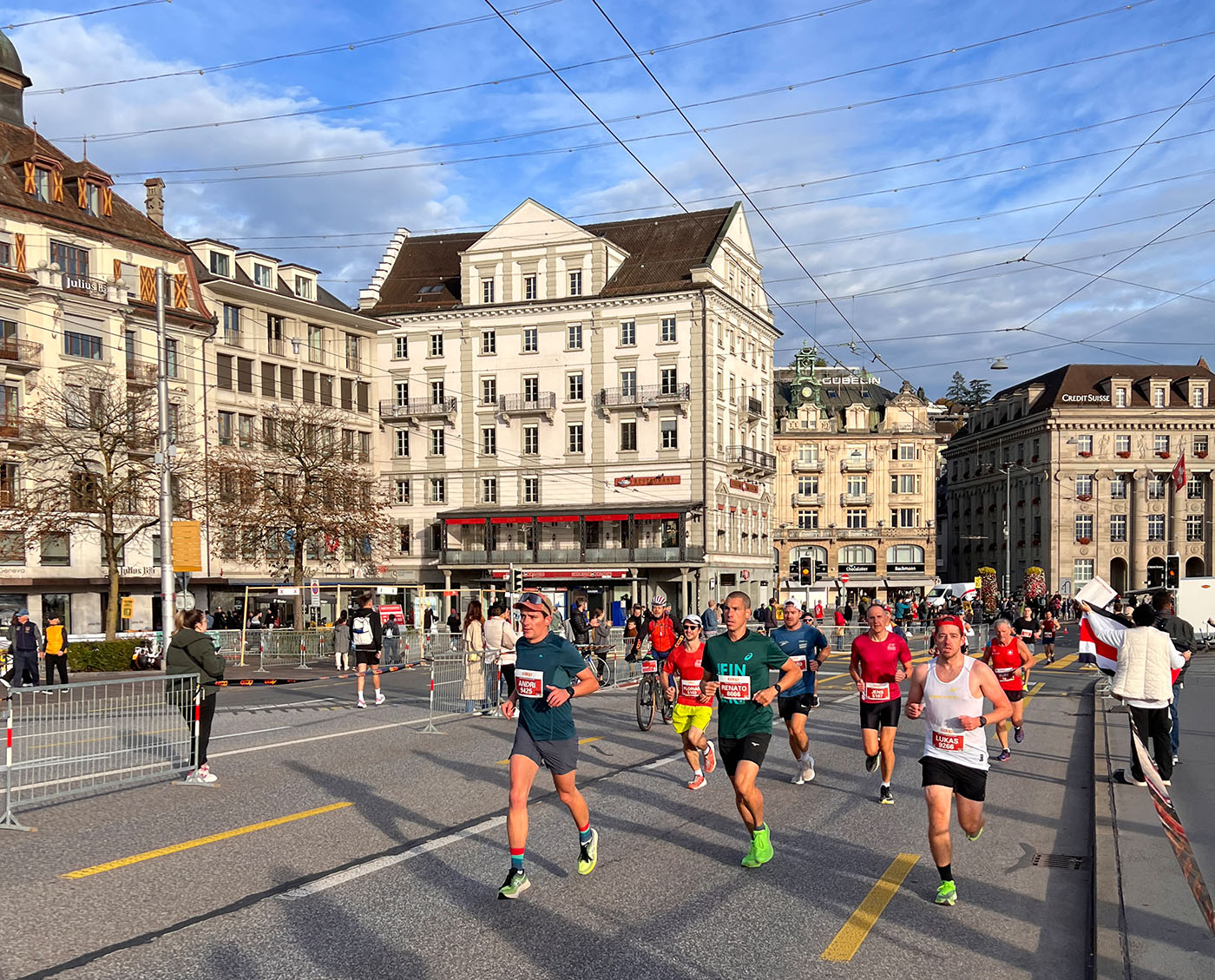 Weiter entlang von Bahnschienen etwas dröge. Doch nur kurz, dann laufen wir durch das Fußballstadion des LC Luzern. Beeindruckende Kulisse, Stimmung ist aber an der Strecke besser. Zurück in die Innenstadt trifft man auf die Läufer, die gerade erst gestartet sind und biegt prompt ins nächste Highlight: mit Partybeleuchtung und Musik geht es durch das Kultur- und Kongresszentrum. Erinnert mich an den Zieleinlauf beim Frankfurt Marathon. Dann gibt es noch einen kleinen Schwenker durch die Altstadt, natürlich weiter mit viel Musik und Applaus. Die letzten 2 Kilometer Richtung Ziel sind dann etwas mühsam, vor allem ist hier kaum jemand der anfeuert.