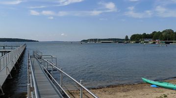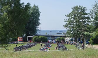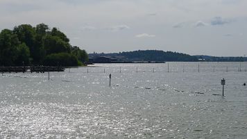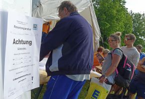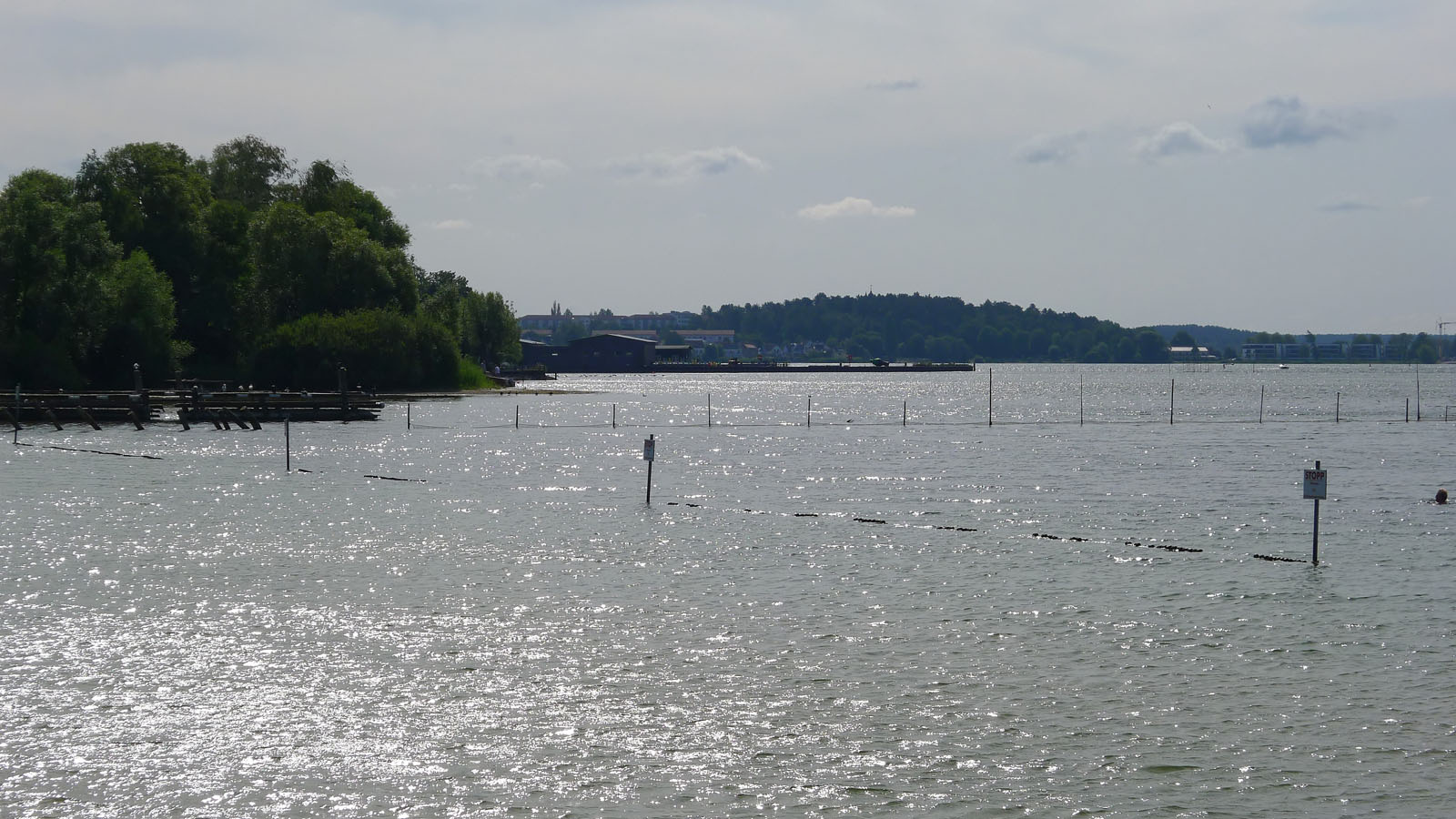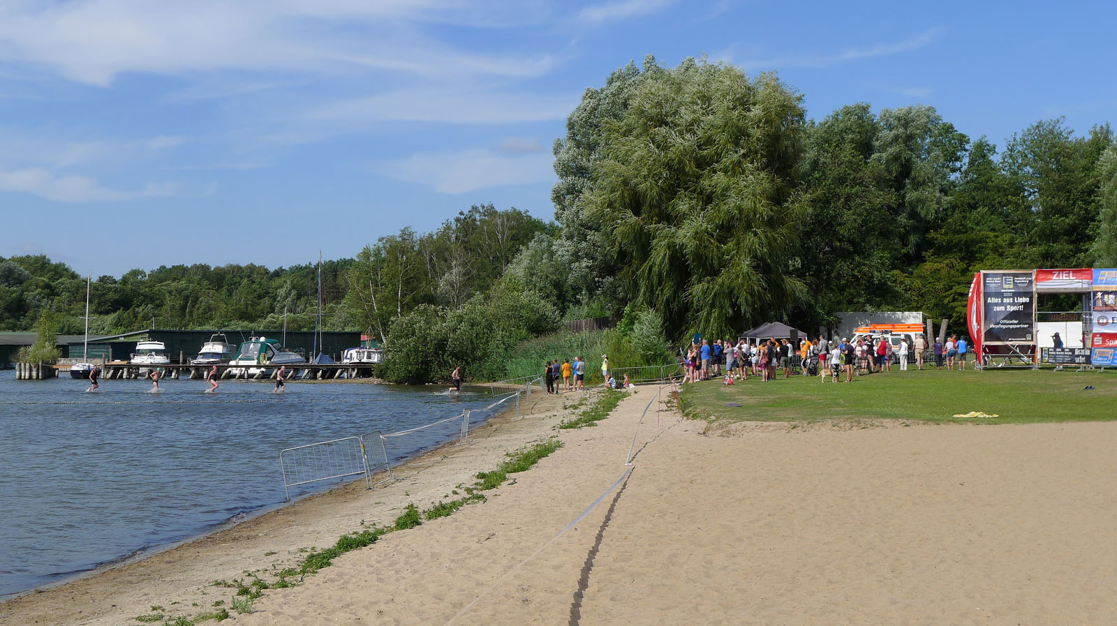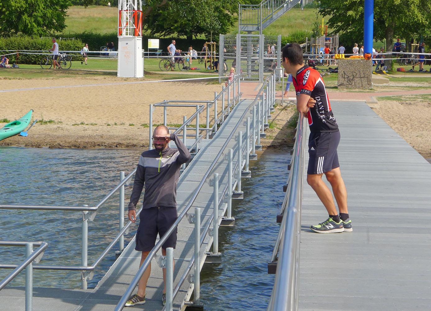 Hatten wir vor zwei Jahren Südsüdwest-Wind, der die Wellen in beachtlicher Höhe durch den Durchlass zum Hauptsee in Richtung Strand trieb, schien diesmal alles ganz einfach: Nordostwind sorgte dafür, dass direkt am Strand praktisch keine Wellen waren, allerdings konnte man in der Ferne Schaumkronen sehen, das war schonmal verdächtig. Außerdem ist der Wasserpegel nach 2 trockenen Sommern gefallen, so dass man bis zum Ende der großen Badebrücke nur im knietiefen Wasser läuft. Da der See groß ist, wurden bei nur 22 Grad Wassertemperatur Neos erlaubt.