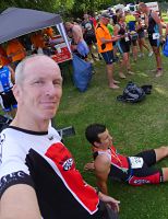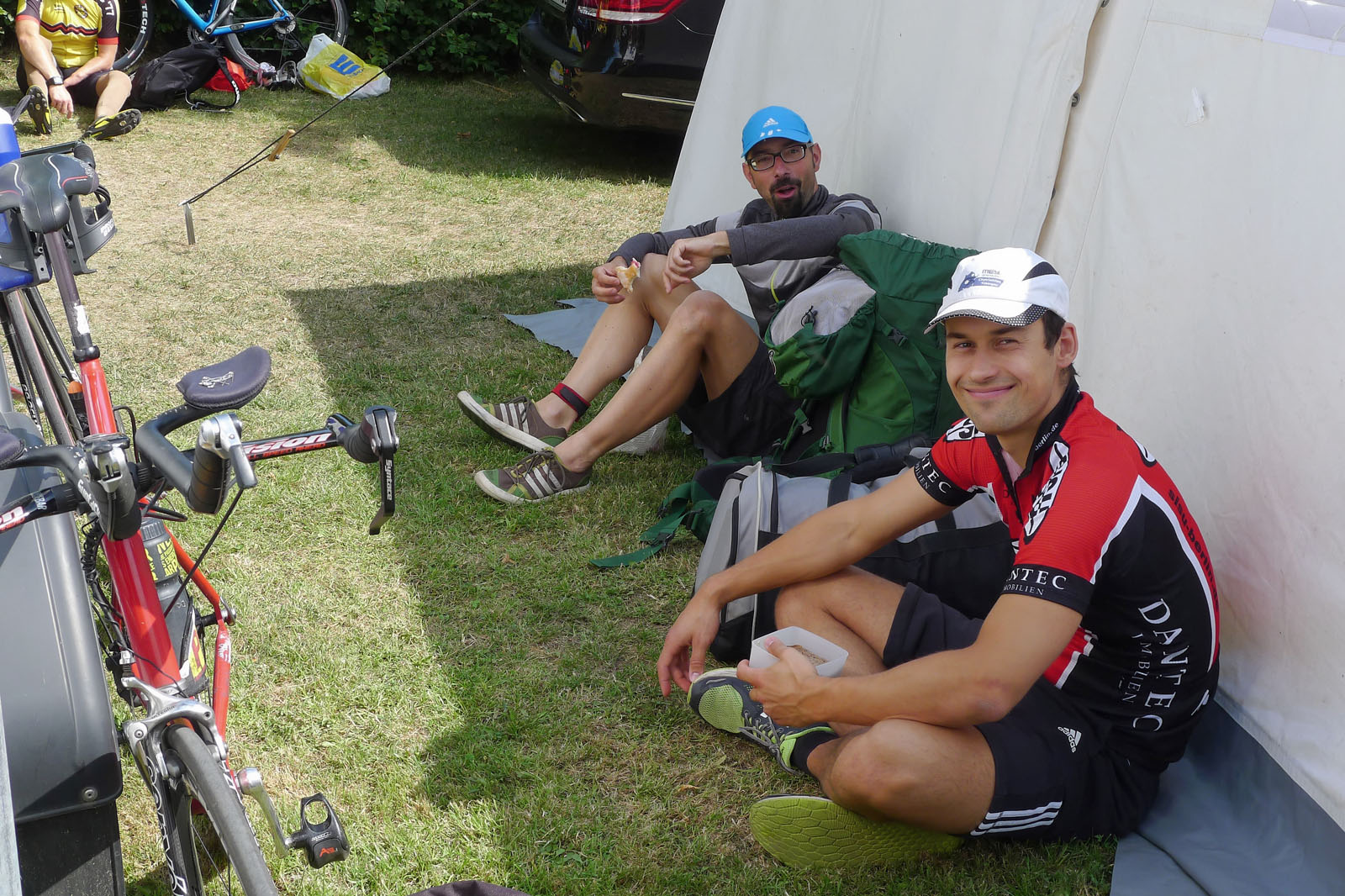Was eine Quälerei! Mit schweren Beinen und angeschlagener Lunge ließ sich nichts mehr rausholen, nur noch das Rennen ins Ziel bringen. Jeder Lauf ist irgendwann vorbei, das Ziel erreicht und die Wiese im Nachzielbereich, Cola wie bei Forrest Gump. So leer war ich lange nicht, natürlich ist jede Mitteldistanz am Ende hart, aber von Anfang bis Ende immer knapp vor der Aufgabe zu sein, das nagt arg am Selbstbewusstein. Vielleicht kann ich wenigstens ein wenig Sisu für mich in Anspruch nehmen. Ankommen ist des Triathleten erste Pflicht, das kann man nicht oft genug betonen! Um kurz vor sieben machten wir uns schließlich auf den Heimweg, es war ein langer Tag. Wenn ich bedenke, dass ich mich ursprünglich nur angemeldet hatte, weil Sonja starten wollte... Die hatte wegen Wadenweh und Uni-Prüfungsstress vernünftigerweise abgesagt.
