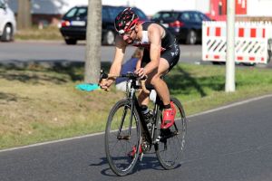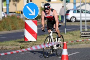 Gregor. Der konnte sich durch eine sehr gute Schwimmleistung von seinem Begleiter absetzen und kam mit Vorsprung in die Wechselzone zum Radfahren. Dort konnte er seinen Vorsprung noch einmal um 2,5 min ausbauen, obwohl auch er keine Rad Gruppe fand. Er lief dann trotz Krämpfen noch einmal ein paar Sekunden weiter nach vorne, um dann mit deutlichem Vorsprung zu wechseln auf...