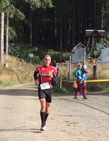 Lustig sind die Verpflegungsstellen unterwegs. Vom Triathlon kennt man ja Energieriegel, Gels, Iso Getränke. Hier sind es Wasser, Apfelschorle und Cola. Essen: Schmalzstulle oder Wiener mit Toastbrot einmal auch Bratwurst, bei der Stelle 9 km vorm Ziel wäre sogar Schwarzbier zu haben gewesen. Also alles etwas anders beim Ultralauf. Ich bin im Sisu Radtrikot gelaufen, so dass ich die Taschen mit reichlich Gels gefüllt habe. Zur Unterhaltung hatte ich mir noch den MP3 Player mit Musik mitgenommen. Das Sisu Trikot hat Christoph unterwegs gesehen, so dass es sogar ein Bild bei km 40 gibt. Die Bilder im Ziel sind von Heike. Ich hatte Christoph zu dem Zeitpunkt bei km 40 nicht gesehen, erst später bei km 55 in Oberhof hatte ich bemerkt, dass er an der Strecke war.