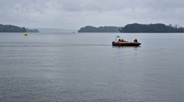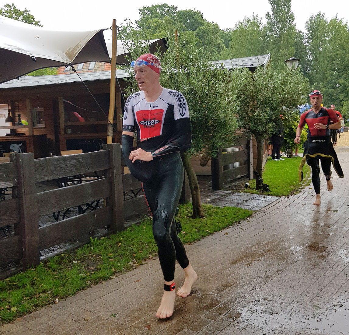 Immerhin: wenn ohnehin klar ist, dass es nass sein wird, dann ergibt man sich von vornherein dem Schicksal und nimmt genug Tüten und Müllbeutel mit, um nach dem Niedergang von 10 Litern auf den Quadratmeter am Ende des Tages trockene Zivilsachen vorzufinden. In zwei Wellen stürzten wir uns in den See, Domenic in der ersten Welle, Carl und ich in der zweiten. Die Starterfelder waren übersichtlich, so dass das Schwimmen eigentlich kein Problem war.