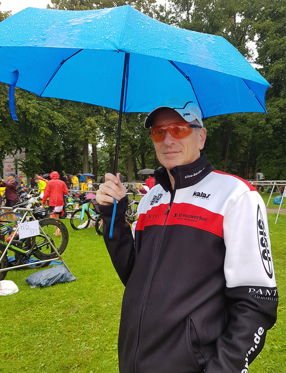 Zum Wettkampftag des Scharmützelsee-Triathlons war völlig unzweifelhaft Dauerregen angesagt. Aus den Starkregen-betroffenen Regionen in Österreich und Slowenien wallte ein ausgedehntes Regengebiet gen Norden. Zuverlässig begann es in der Nacht zu regnen und sollte bis zum Abend nicht mehr aufhören. Immerhin war es nicht wirklich kalt und auch kaum windig.