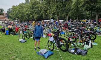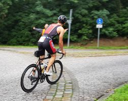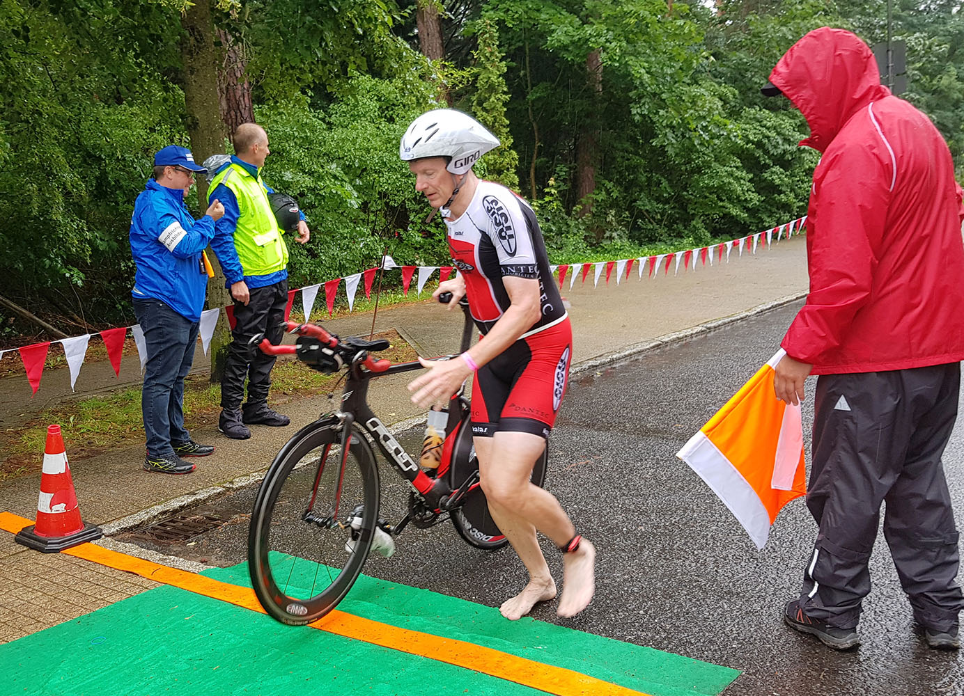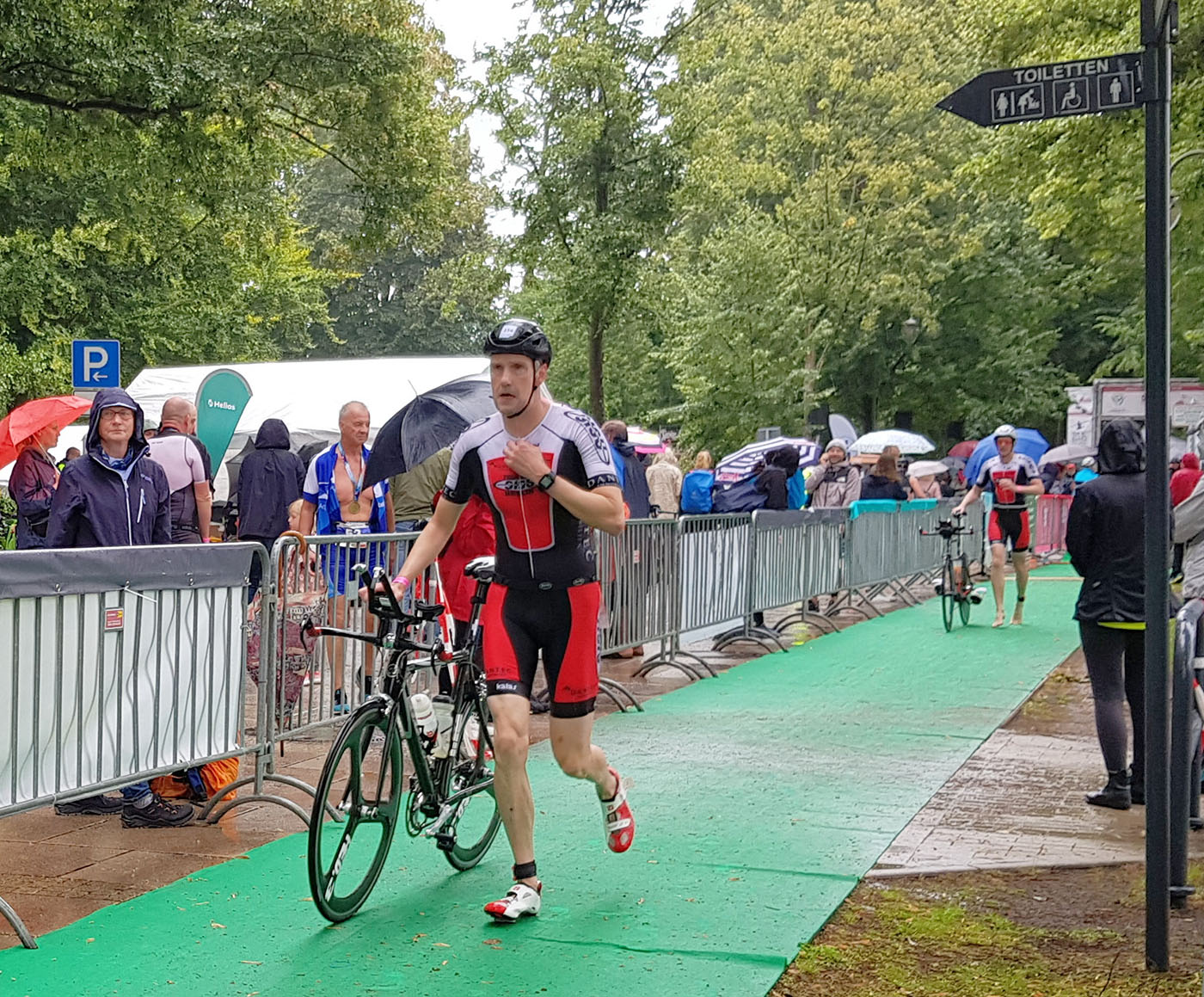 Die Radstrecke war zwar mit gut 36 Kilometern recht kurz, dafür aber ordentlich hügelig. Nicht wirklich steil, aber es gibt kaum ebene Abschnitte, man ist teils ganz schön am Kämpfen. Der Asphalt ist größtenteils sehr gut, nur in den Kreisverkehren muss man bei Nässe etwas aufpassen. So gelang es keinem von uns dreien, die Radstrecke unter einer Stunde abzuhaken. Meine Netto-Messung stoppte bei 1:02 h und ein paar Sekunden – na immerhin.