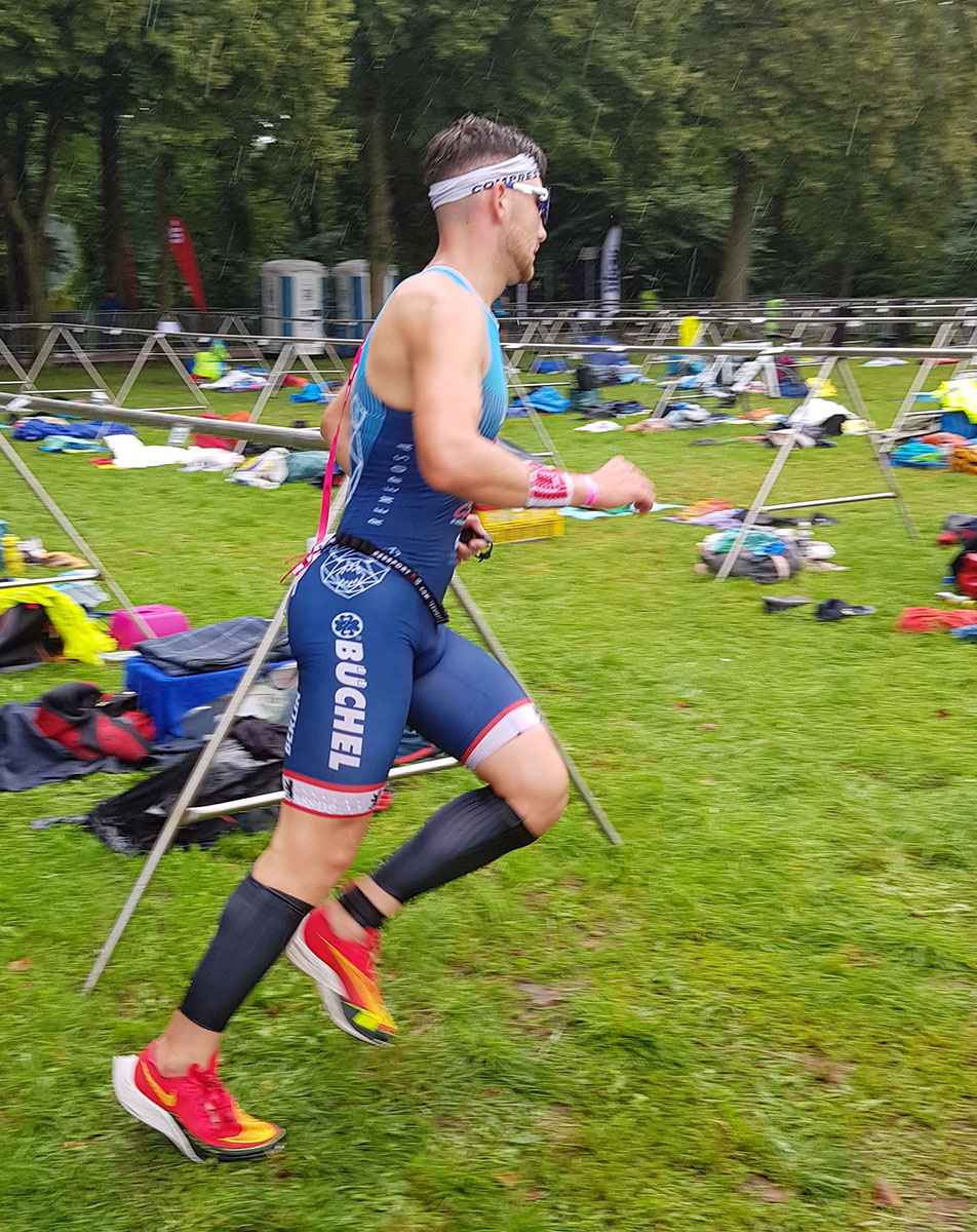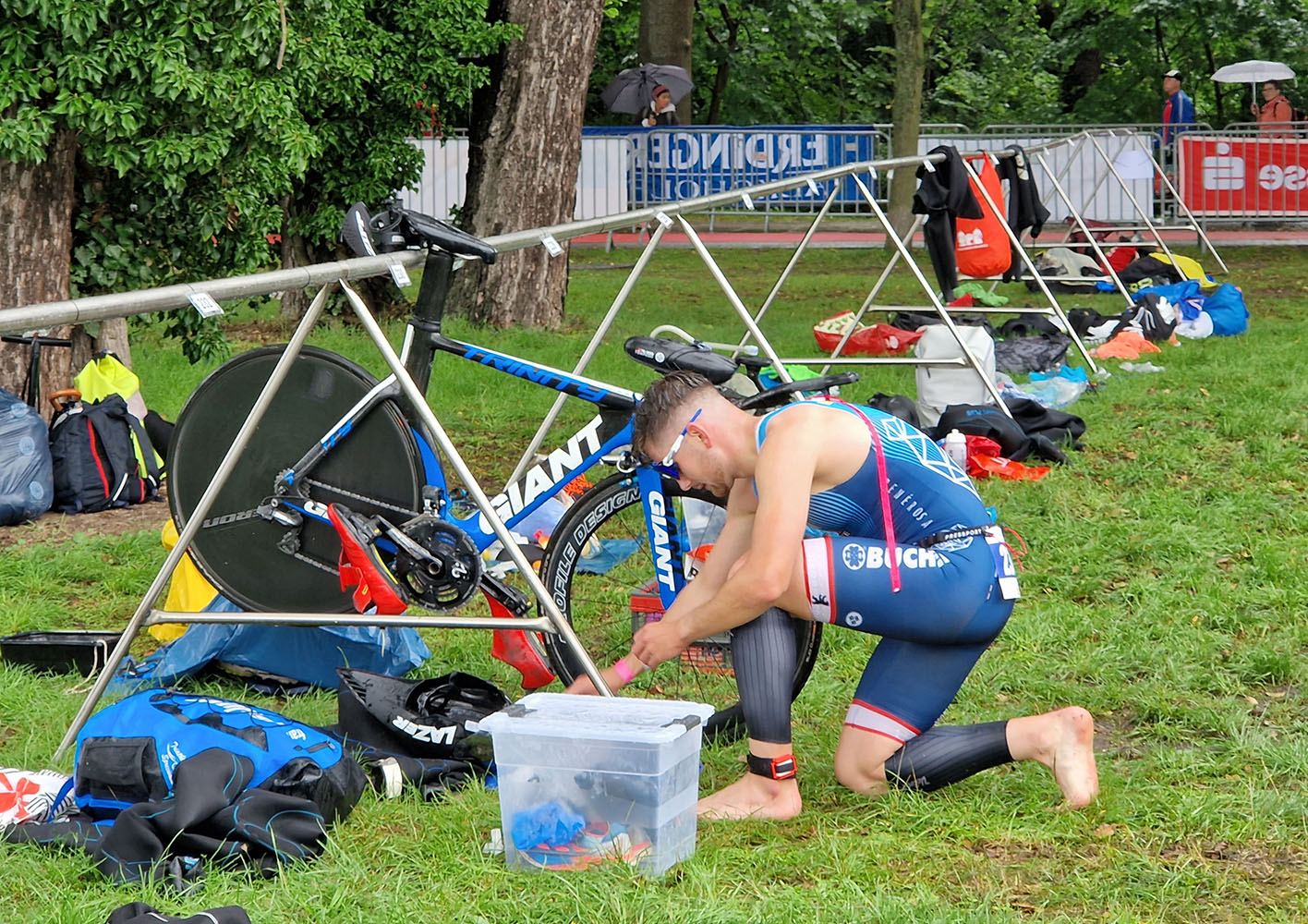 Auf der kurzen Distanz haben alle Einzeldisziplinen zwei statt einer Runde wie beim Sprint. Da fallen dann die langen Laufwege zur und von der Radstrecke nicht mehr so ins Gewicht. Eigentlich hat der Wettkampf nämlich drei Läufe, wobei die Wechselläufe zum Teil in den Wechselzeiten und in der Radzeit stecken.
