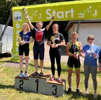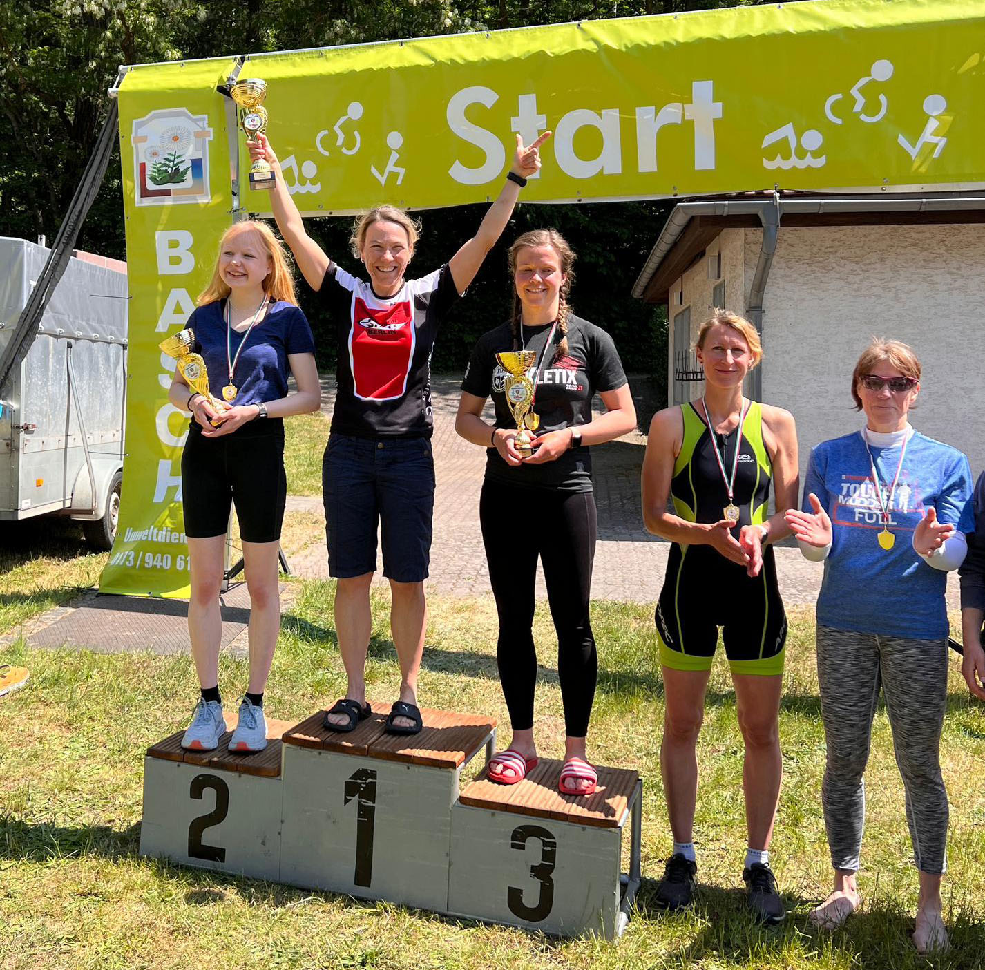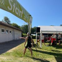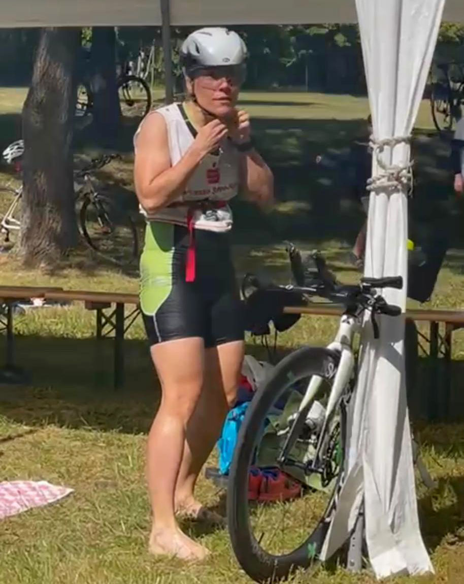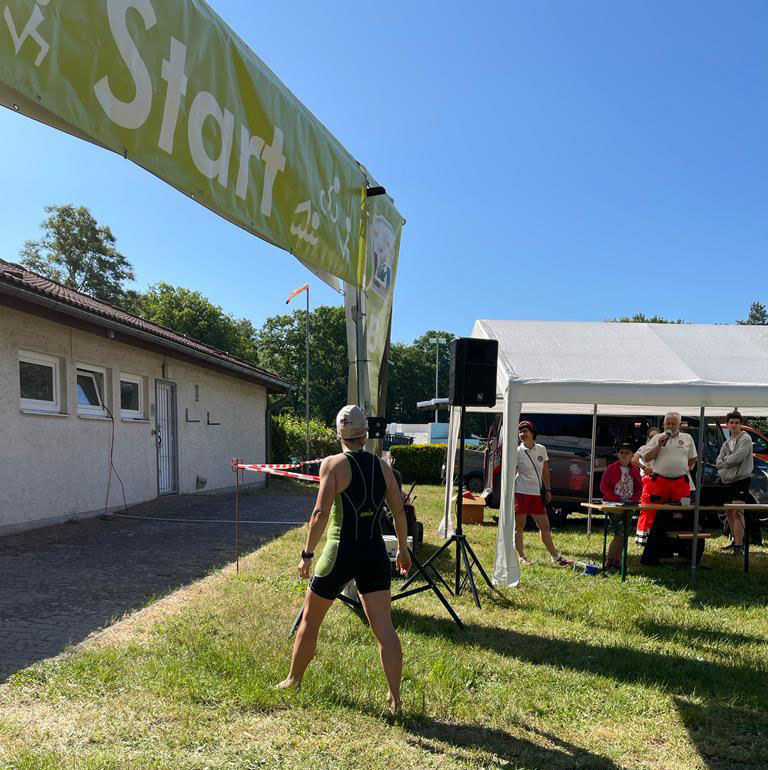 Der Wettkampftrubel bringt dann etwas Ablenkung. Anmeldung und Bezahlung (unglaubliche 10 Euro) und irgendwo einen Wechselplatz suchen. Dafür gibt es ein Zelt mit Stangen, diverse Fahrradständer, Hauswände – je nach Gusto. Startzeiten werden in Gruppen verlost: erst die Damen, dann die Herren, dann Familienstaffeln und dann allgemeine Staffeln. Heute sind ca. 60 Starter, davon 10 Frauen. Ich ziehe Nummer 4, eine Freundin wagt sich nach mehreren Staffelstarts an ihren ersten eigenen Triathlon und wird mit Nummer 7 nach mir starten.