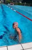 Gestartet wird mit 1 Minute Abstand, kleiner Lauf zum Schwimmbecken und los gehen 500 Meter schwimmen auf der ausgewiesenen Bahn. Das Wasser ist recht kalt, und mit über 1:40 auf der Uhr fühle ich mich unglaublich langsam. Dabei vergesse ich den Anlaufweg – ab Ende wird es die zweitschnellste Schwimmzeit des Tages. Nur der Gewinner der Herrenwertung schlägt mich. Die Bahnen werden am Rand gezählt und man erhält bei Bedarf den Zählerstand. Ich zähle gleich richtig, hüpfe aus dem Becken und zum Rad. Mit den Jahren habe ich eine ausgeklügelte Technik entwickelt, das obligatorische Laibchen mit der Startnummer überzuwerfen: vorher in sich aufrollen und ein Gummiband mitnehmen, damit es beim Radfahren nicht zu sehr rumflattert.