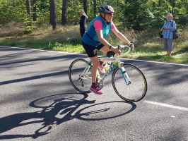 Klar, Denise hat mich bald eingeholt, und auch Merle und Kerstin waren gut unterwegs. Das zog sich ganz schön bis hinten zur Wende, aber schließlich war das Ziel wieder in Sicht, und nach dem Überlaufen der Zeitmatte ging es im langen Bogen über die Straße in die Wechselzone. Die Radstrecke war teils neu, wir hatten 3 Wendepunkte, so dass wir nicht bis auf die Hauptstraße fahren mussten. Die nahe Wende wurde kurz vor der Wechselzone eingerichtet.