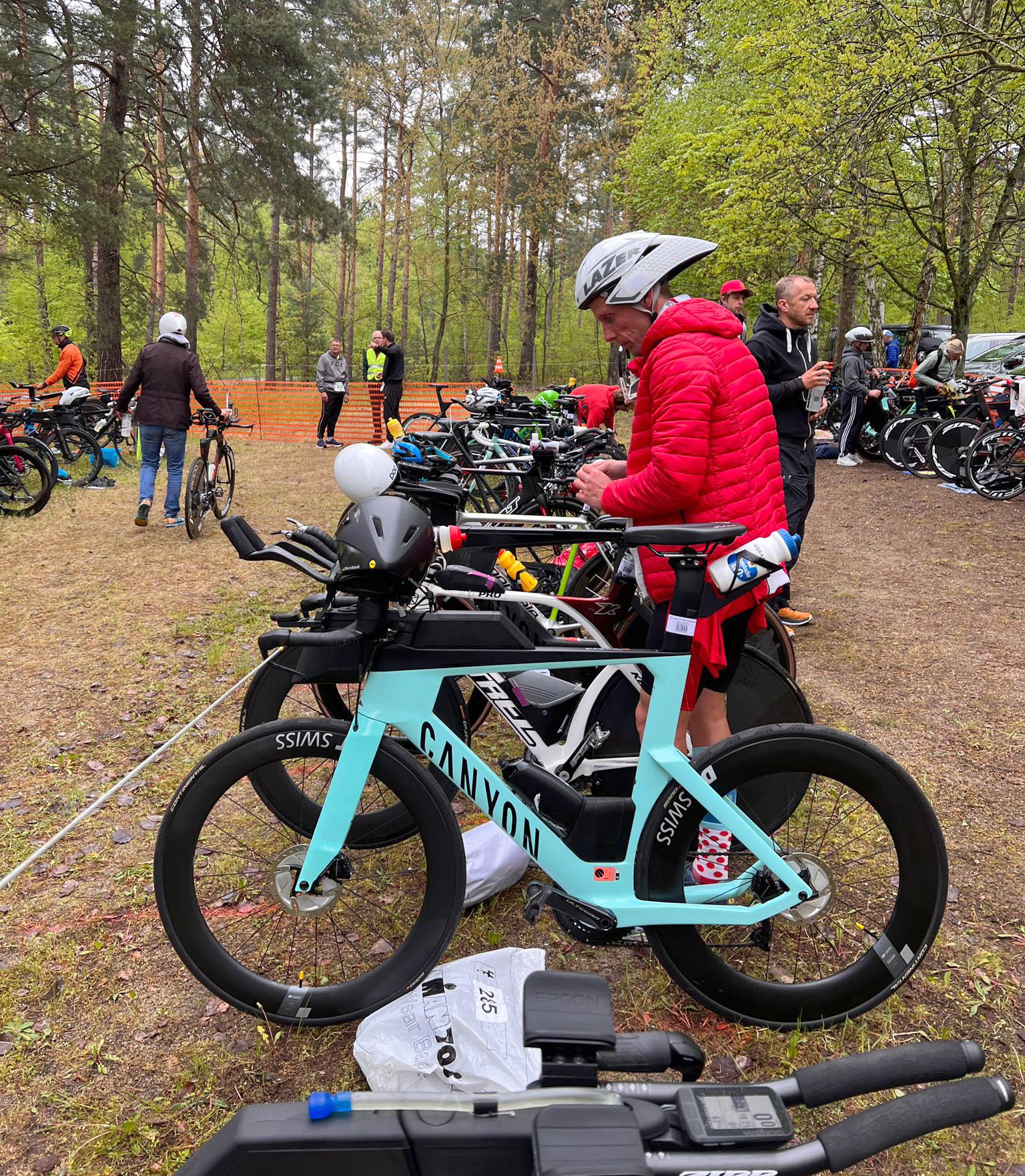 Als ich in der Wechselzone ankomme, stehen nur noch eine Handvoll Räder da. Dies ist ein sehr ungewohnter Anblick für mich, die doch beim Schwimmen meist recht weit vorn in die Wechselzone kommt. Ich freue mich über die bereitgelegte Radjacke, gegebenenfalls sind die gewünschten Handschuhe in der Rückentasche. Die Schuhe habe ich zum Glück mit Neoprenzehenschutz übersehen. Auf nasser Straße geht es los, gepaart mit fiesem Nieselregen. Die Oberschenkel sind zu kalt, um wirklich gut reintreten zu können. Aber ansonsten friere ich nicht. Ich brauche nicht mal meine Handschuhe und habe sogar richtig Spaß mich den Gewalten der Natur zu stellen. Am Ende der ersten Radrunde ist die Straße sogar recht trocken, die Freude darüber wird durch einen richtigen Regenschauer gebremst.