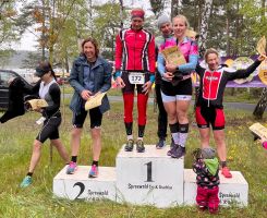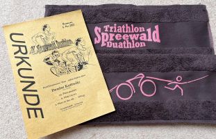 Laufen ist am Anfang richtig steif, ob von müder oder kalter Muskulatur, kann ich nicht sagen. Zum Glück löst sich das bald, und das macht mich so glücklich, dass ich gar nicht auf die Idee komme, noch etwas schneller zu laufen. Mich überholt tatsächlich Sabine noch, die ich beim Rad eingeholt hatte. So belege ich heute tatsächlich mal den letzten Platz in der Damenwertung. Muss man auch mal erleben, aber das Altersklassenhandtuch erhalte ich dennoch.