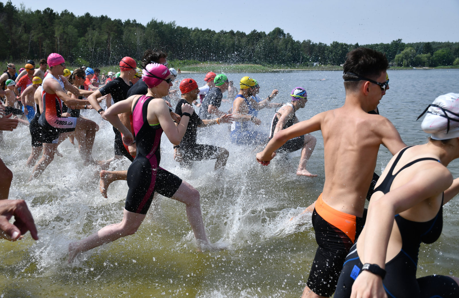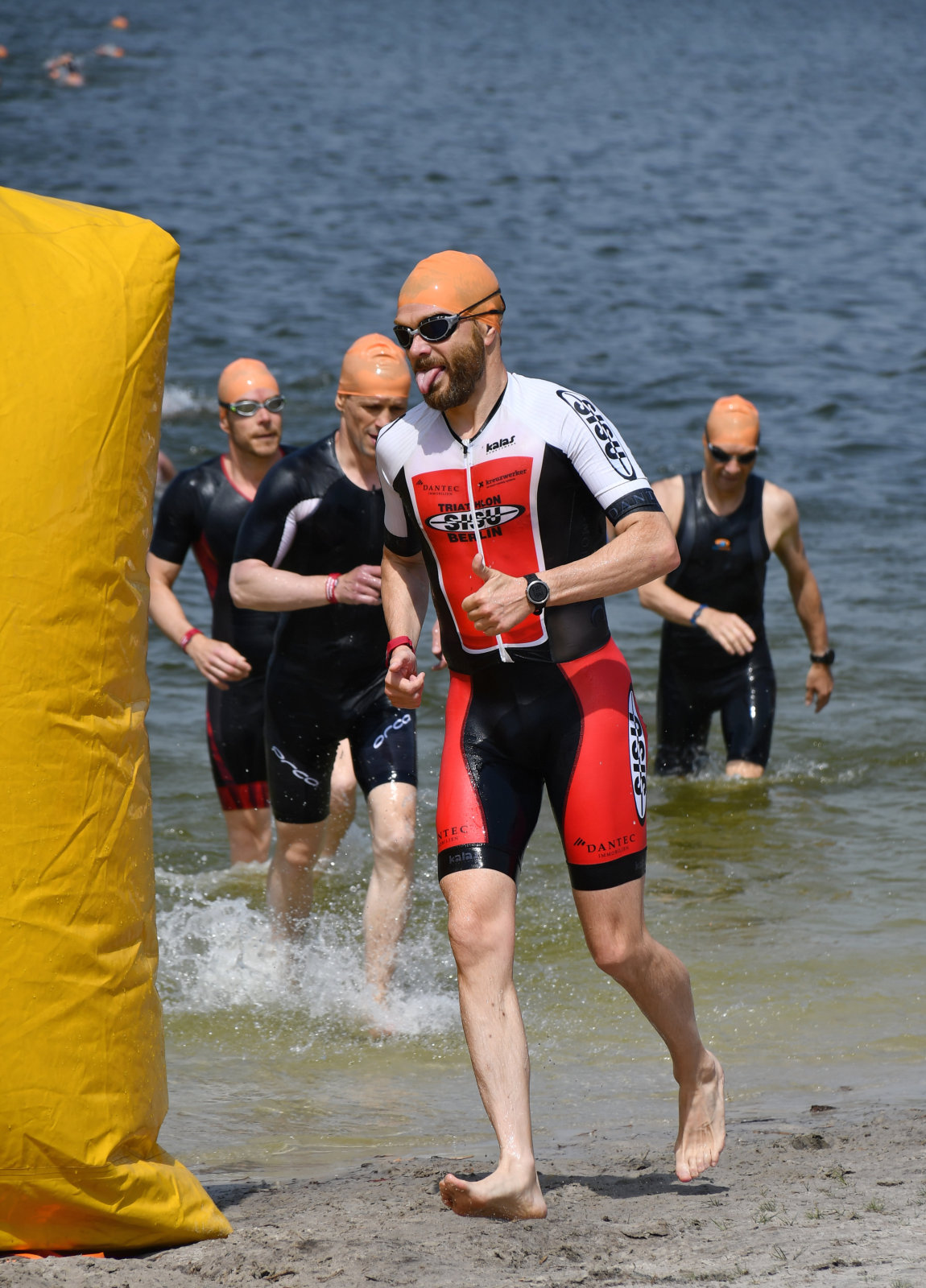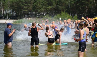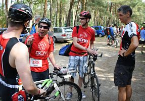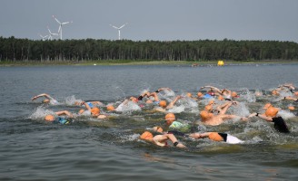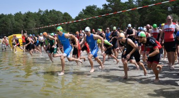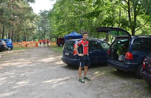 Aber beginnen wir von vorn: Als wir vermeintlich sehr zeitig um Dreiviertel neun am Briesensee vorfuhren, wurde gerade die letzte Fläche des Parkplatzes gefüllt, nämlich direkt vor dem Eingang der Wechselzone. Micha, den wir kurz zuvor auf der Autobahn überholt hatten, bog kurz dahinter ein, wir hatten sozusagen die Pole-Position, sehr praktisch und mit kurzen Wegen. So langsam trafen die Sisus ein, insgesamt 25 von uns gingen auf die drei Wettkampfstrecken. Das ist vielleicht kein neuer Rekord, hatte aber doch die Größenordnung unserer Mitgliederversammlung. Ein paar Angehörige und Unterstützer waren auch dabei, die Familien picknickten gleich am Badestrand.