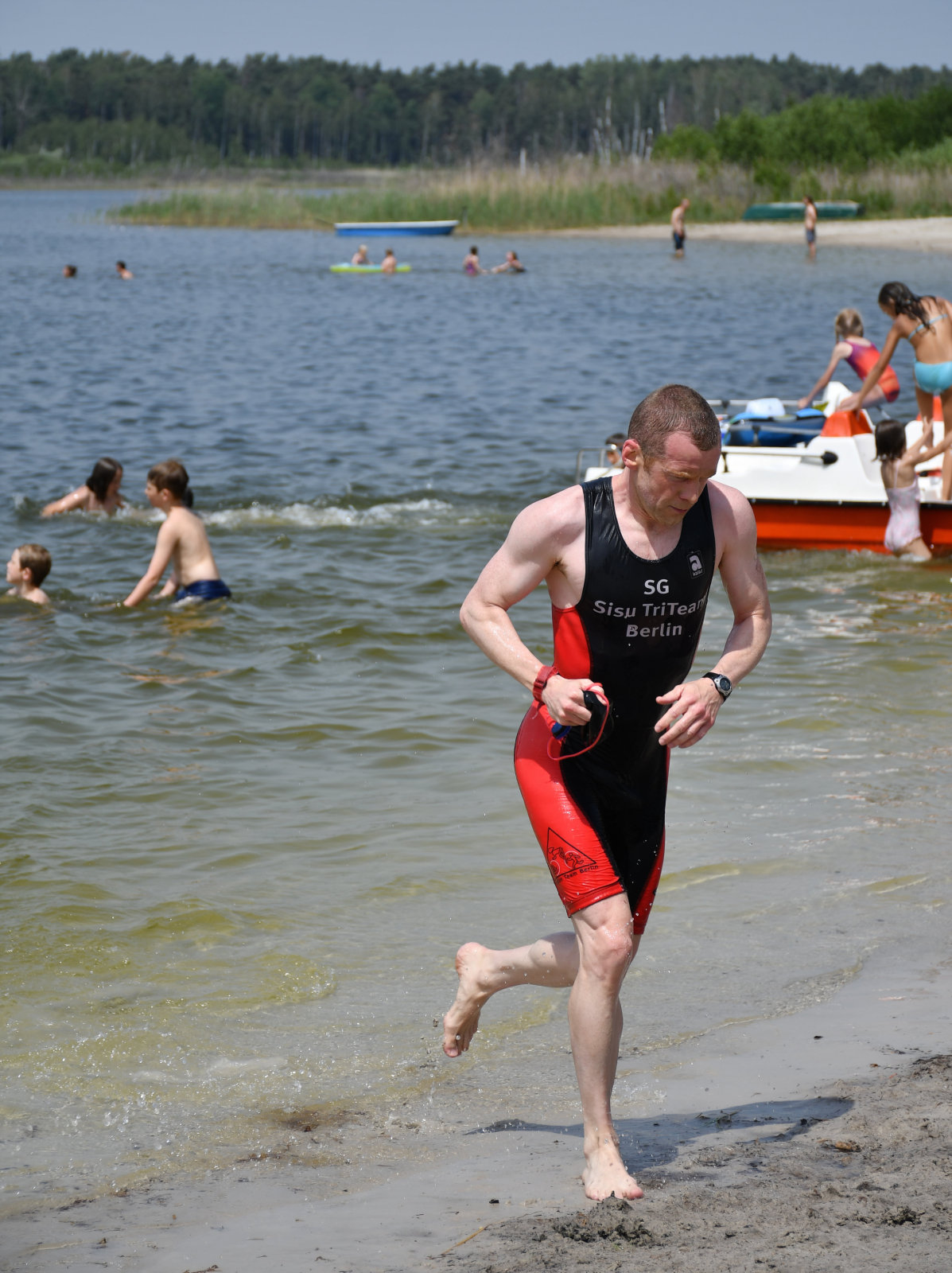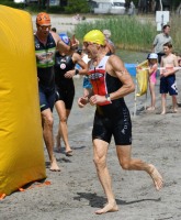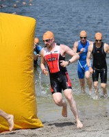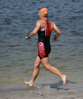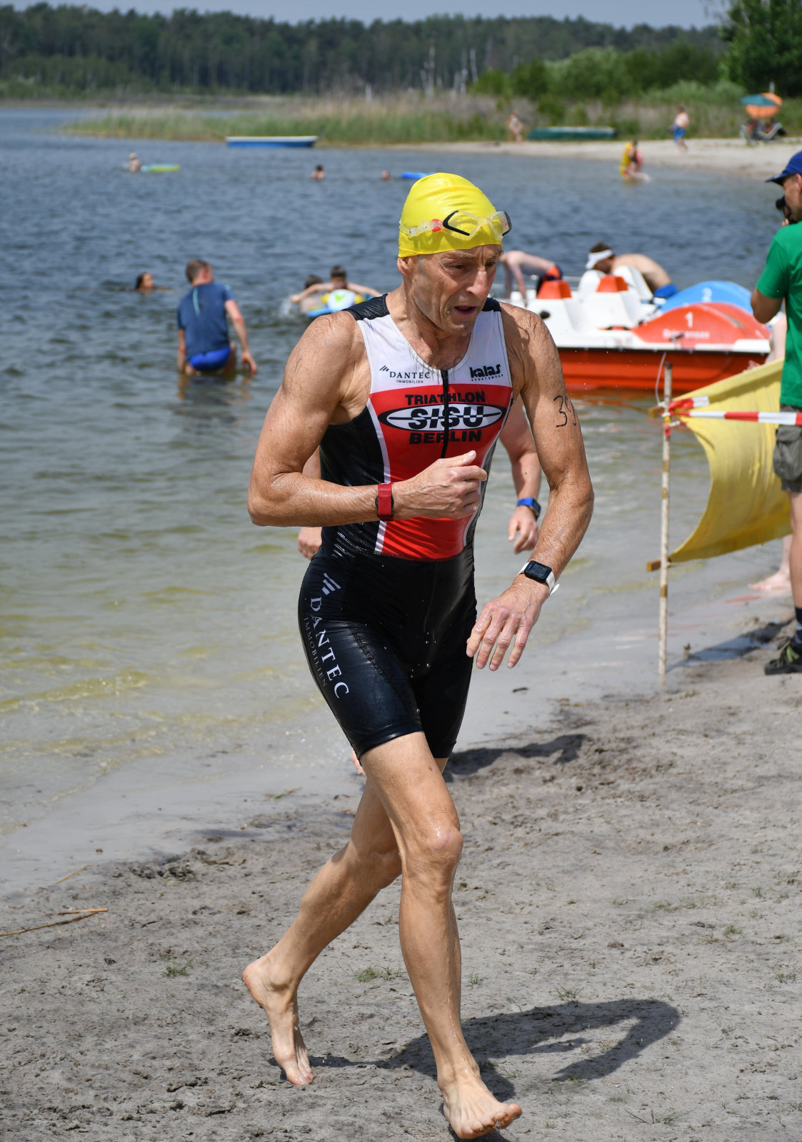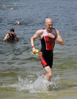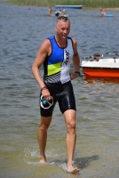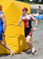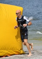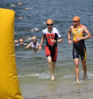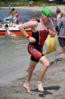 Drei Schwimmrunden waren zu absolvieren, jeweils mit Landgang dazwischen. Am Ende hebt man sich etwas schwer aus dem Wasser, rennt den Sandweg hoch, an der Zeitnahme vorbei und in die Wechselzone oben am Parkplatz, da ist der Kreislauf dann richtig in Schwung.