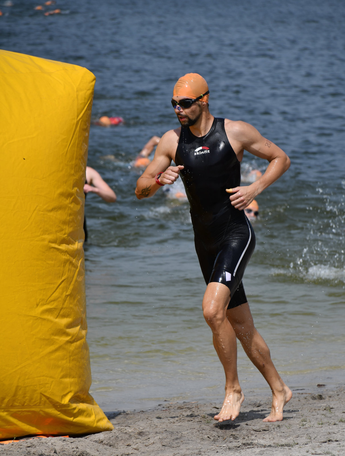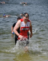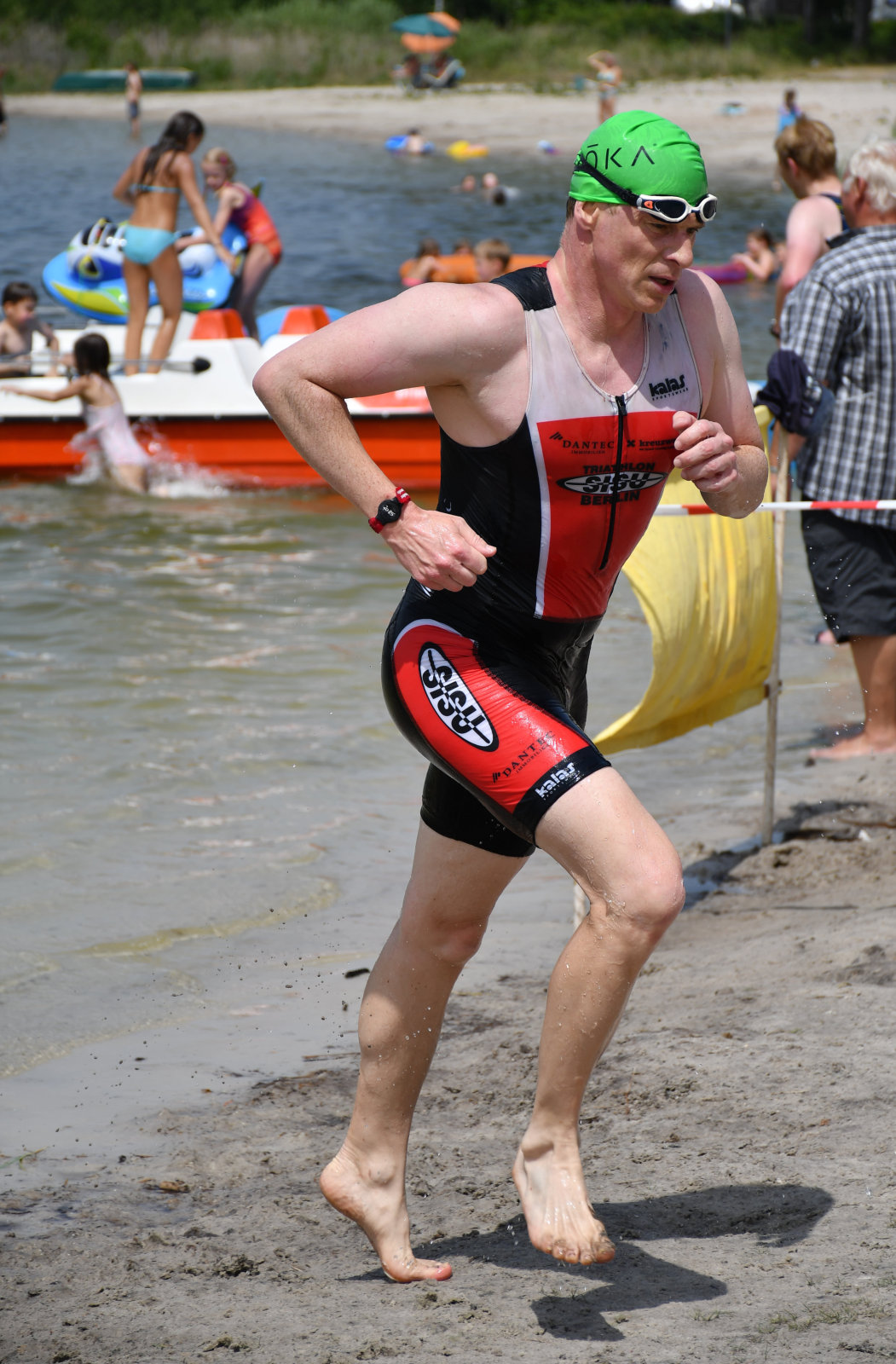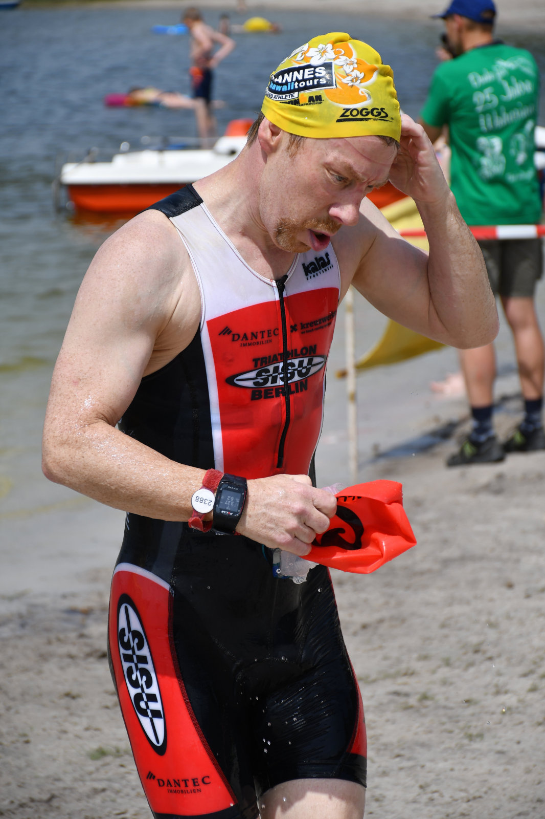 Drei Schwimmrunden waren zu absolvieren, jeweils mit Landgang dazwischen. Am Ende hebt man sich etwas schwer aus dem Wasser, rennt den Sandweg hoch, an der Zeitnahme vorbei und in die Wechselzone oben am Parkplatz, da ist der Kreislauf dann richtig in Schwung.