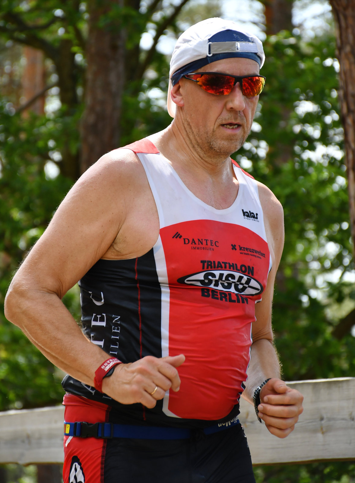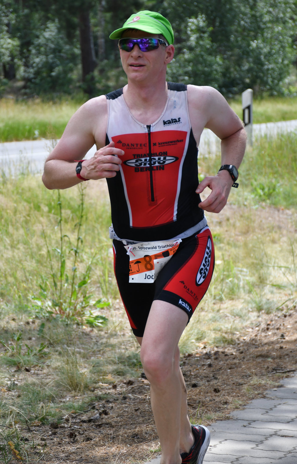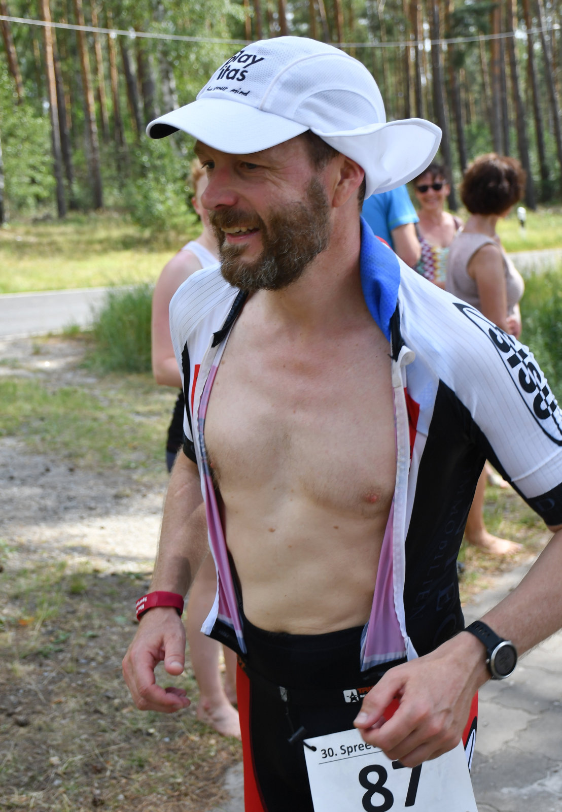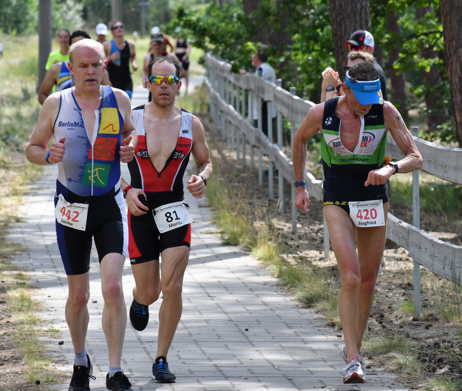 Beim Laufen konnten wir zusehen (Sonja hatte die Kamera, ich kam nach meinem Zieleinlauf mit der Bratwurst dazu), wie die Sisus Runde für Runde aus dem Wald kamen und sich um Haltung bemühten. Die Schritte wurden schwerer, das ging aber allen so, auch die besten waren bei weitem nicht so schnell wie an kühleren Tagen. Man konnte interessante Kühlungsvarianten bewundern, die üblichen Käppis, Tropenmützen, Schwämme überall, Löcher im Einteiler, nasse Handtücher und manches mehr.