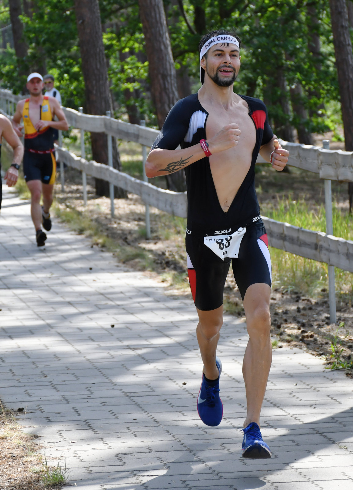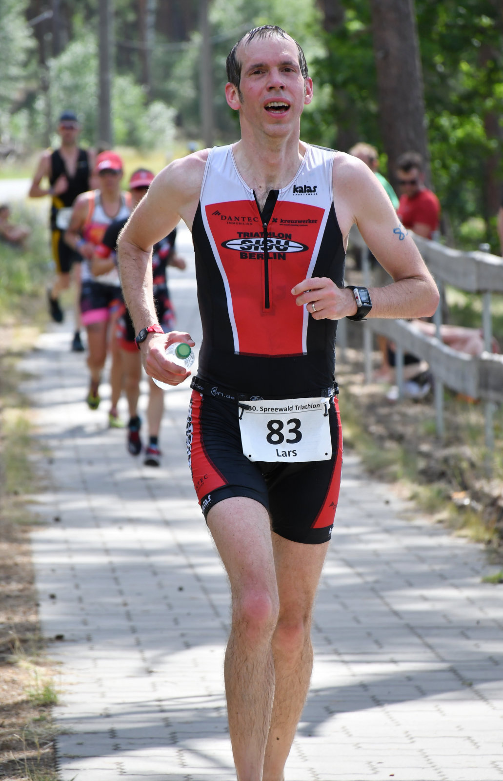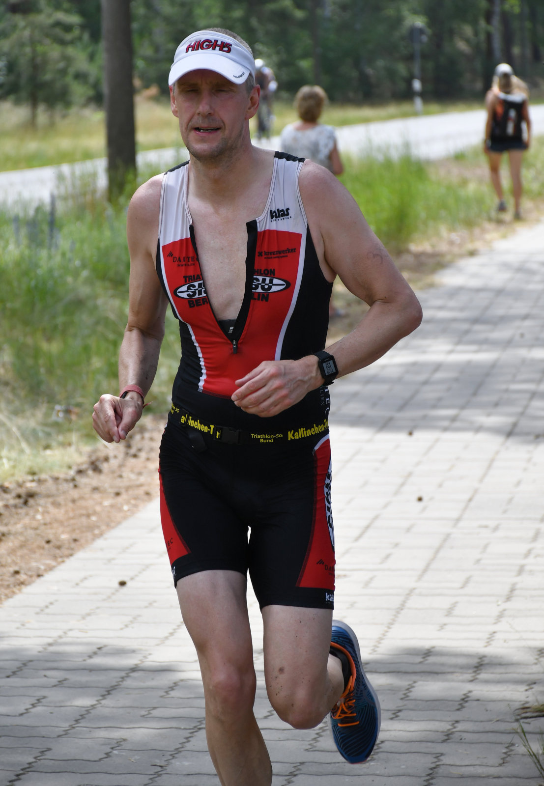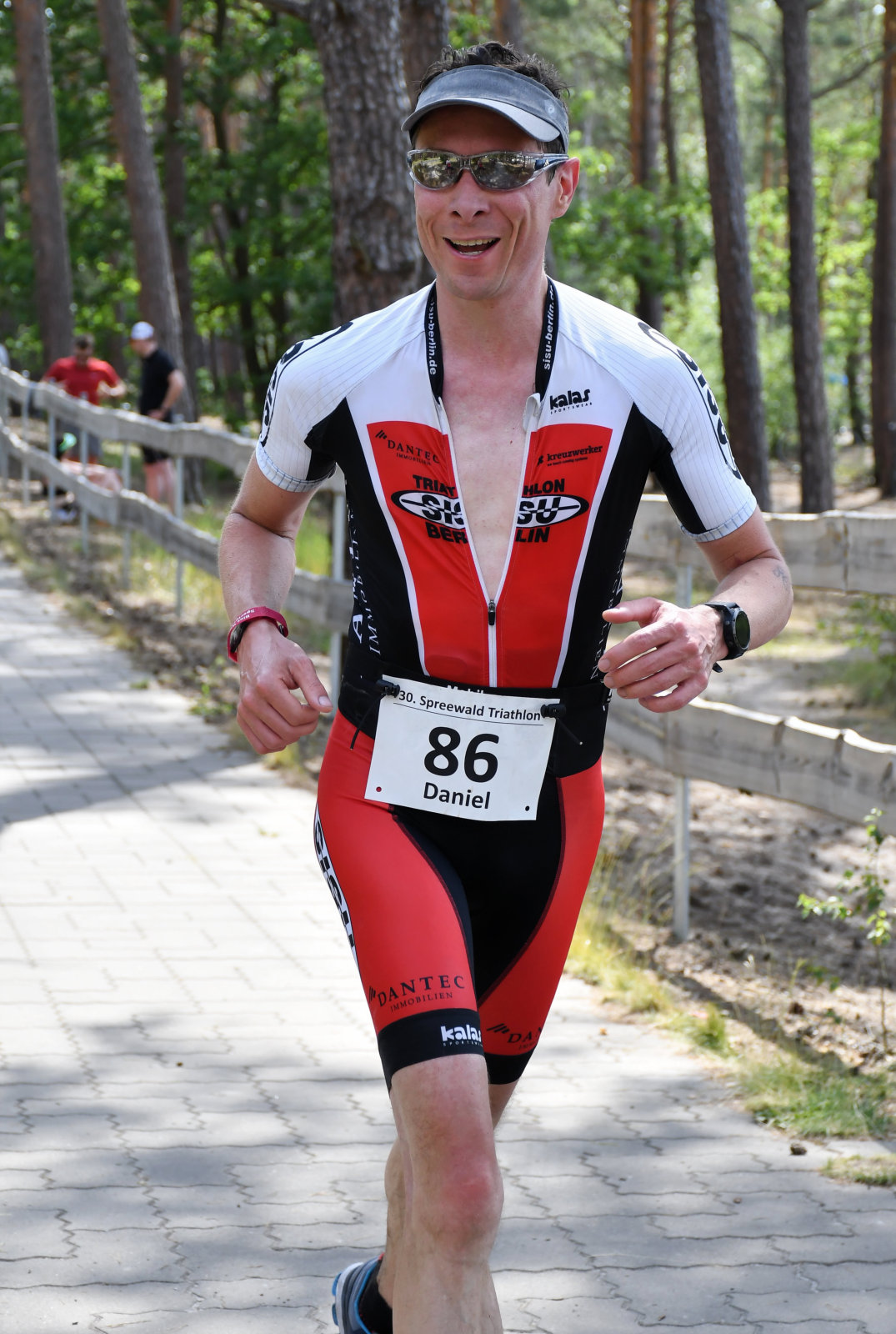 Beim Laufen konnten wir zusehen (Sonja hatte die Kamera, ich kam nach meinem Zieleinlauf mit der Bratwurst dazu), wie die Sisus Runde für Runde aus dem Wald kamen und sich um Haltung bemühten. Die Schritte wurden schwerer, das ging aber allen so, auch die besten waren bei weitem nicht so schnell wie an kühleren Tagen. Man konnte interessante Kühlungsvarianten bewundern, die üblichen Käppis, Tropenmützen, Schwämme überall, Löcher im Einteiler, nasse Handtücher und manches mehr.