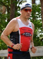 Am Ende war ex-Sisu Jim am schnellsten aus dem Wasser, kurz danach Jochen, da läuft die Schwimmerei auch ohne viel Training. Mit Ingo hatte ich die Wette laufen, bis wo im Wettkampf ich mich vor ihm halten kann, das würde in jedem Fall knapp werden. Nach dem Schwimmen hatte ich 40 Sekunden, aber das weiß man ja immer erst hinterher. Da der Wettkampf keine Wendepunkte hat, trifft man andere Teilnehmer oft gar nicht unterwegs. Frank war gut dabei, der Mann ist diese Saison erstmals in der M65 unterwegs!