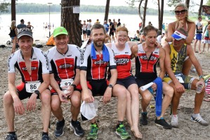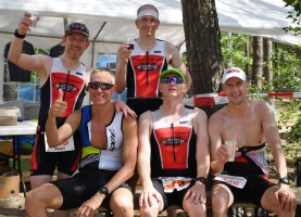 Die Mitteldistanz war schon vor der Kurzstrecke gestartet. Micha war wie meistens ziemlich weit vorn dabei, Moritz auch gut beim Schwimmen und der Rest dahinter. Denise als unsere einzige Frau auf den längeren Strecken lag sehr gut in der Damen-Konkurrenz, das Langdistanz-Training zeigt langsam Wirkung, eine gute Ausgangsposition.