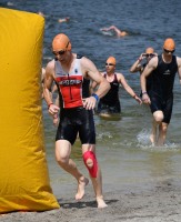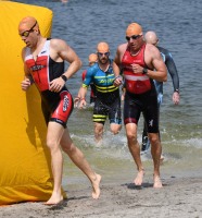 Subjektiv lief die Sache ganz gut, aber ohne Neo fehlt irgendwie immer der richtige Zug und die gute Wasserlage. Nach Meinung vieler war der Schwimmkurs etwas auf der langen Seite, jedenfalls war ich doch etwas überrascht, als nach 2 Runden um die Bojen fast 30 Minuten auf der Uhr standen. Bin ich wirklich so langsam? Aber die Zeiten der guten Schwimmer im Feld waren auch nicht wahnsinnig schnell, das beruhigt.
