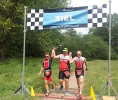 Die Aufgabenverteilung war klar, Christopher als Startschwimmer sollte vorne dranbleiben, ich nicht so viel schlechter schwimmen und mich von den anderen beiden aus dem Neo pellen lassen, und Sven wollte ausgeruht viel auf der Radstrecke führen. Das klappte mit einigen Einschränkungen bei meiner Schwimmerei vorzüglich. Sven zeigte, was für ein guter Radfahrer er ist und wie gut wir drei als Mannschaft harmonierten. Mit 36 Minuten bin ich noch nie so schnell über die 20 km Rad gefahren. Den abschließenden Lauf über 5 km brachten wir dann auch noch anständig hinter uns.