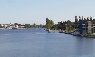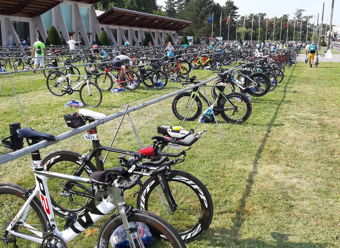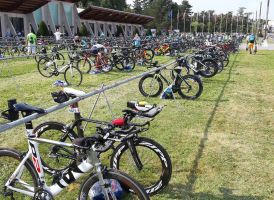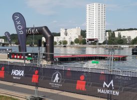 Wir sind ein Sportverein, kommen wir also zum Rennen. Schwimmen wie auch ohne Corona-Bedingungen als Rolling Start, ich hatte mich im Block 1 Stunde bis 1:02 einsortiert. Die Schwimmstrecke ist im aufgestauten Fluss Allier 2 km in einer Richtung und etwas kürzer zurück zum Ausstieg. Mit einer 1:01er Zeit mit Neo war ich etwas langsamer als die letzten Male in der Langdistanz, wo ich unter der Stunde geblieben war. Möglicherweise fehlte doch das Winter- und Frühjahrstraining durch die Schließung der Trainingsstätten.